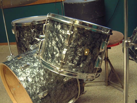 Finish: all with Black Diamond Sparkle – Not sure on this but it is the closest color/pattern I could find in the catalogs from the early 1960s timeframe. Actually looks a little green under artificial light. For years I called it my green Ludwig set because it seemed to have a green tint.