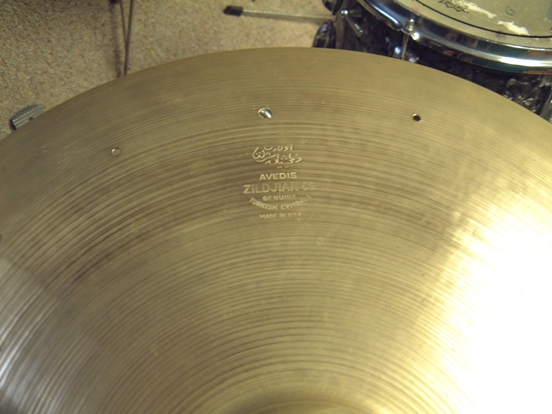 22” ride with 1 3/4” avedis zildjian stamp (hollow letter Zildjian Co) – the ride has punched holes in it from the original owner who installed ‘sizzlers’.