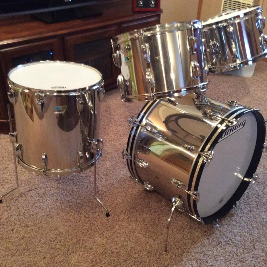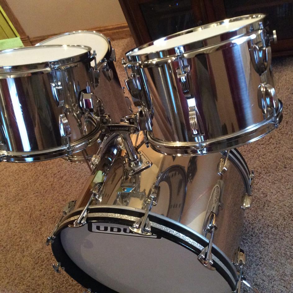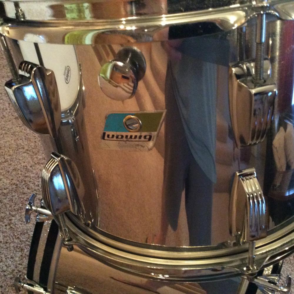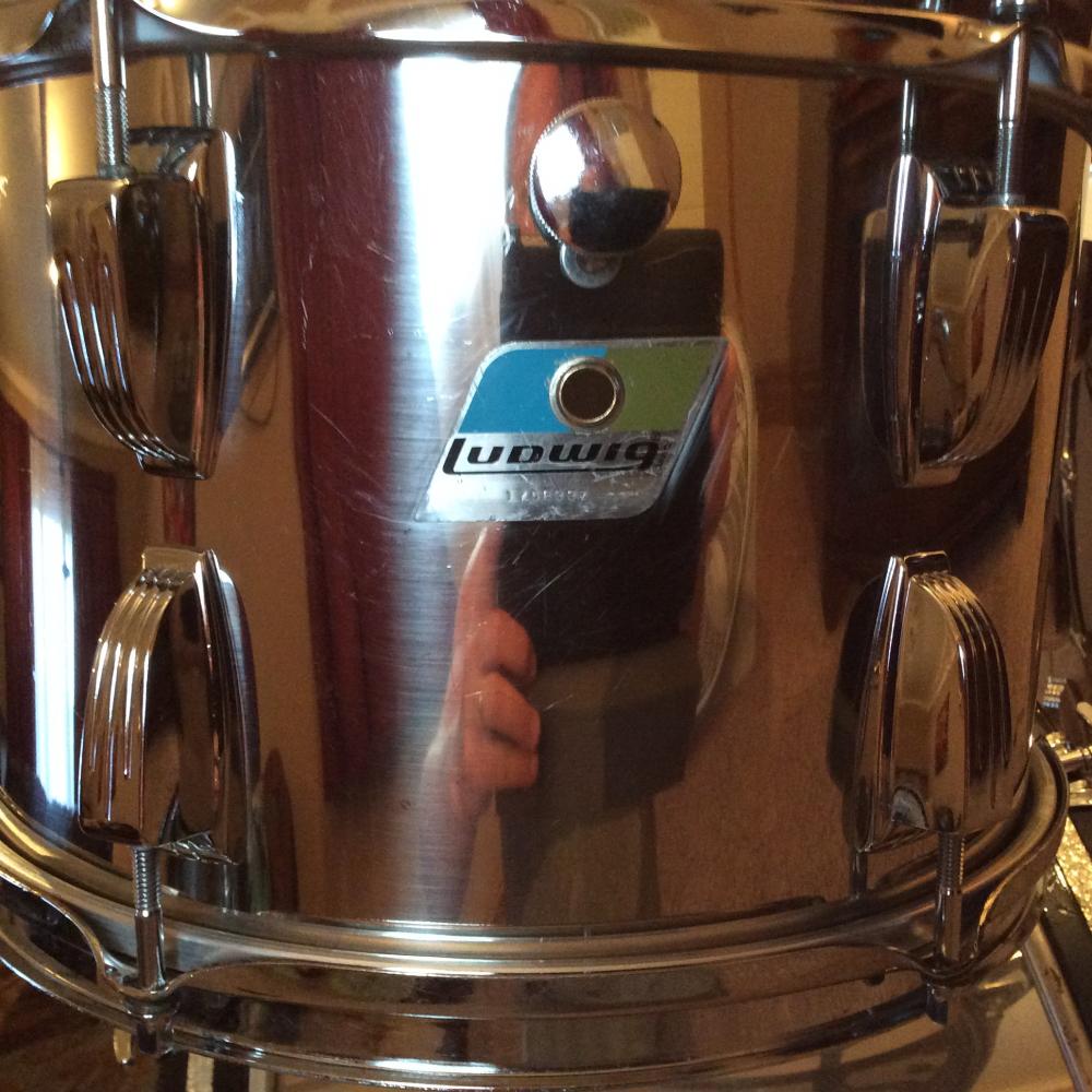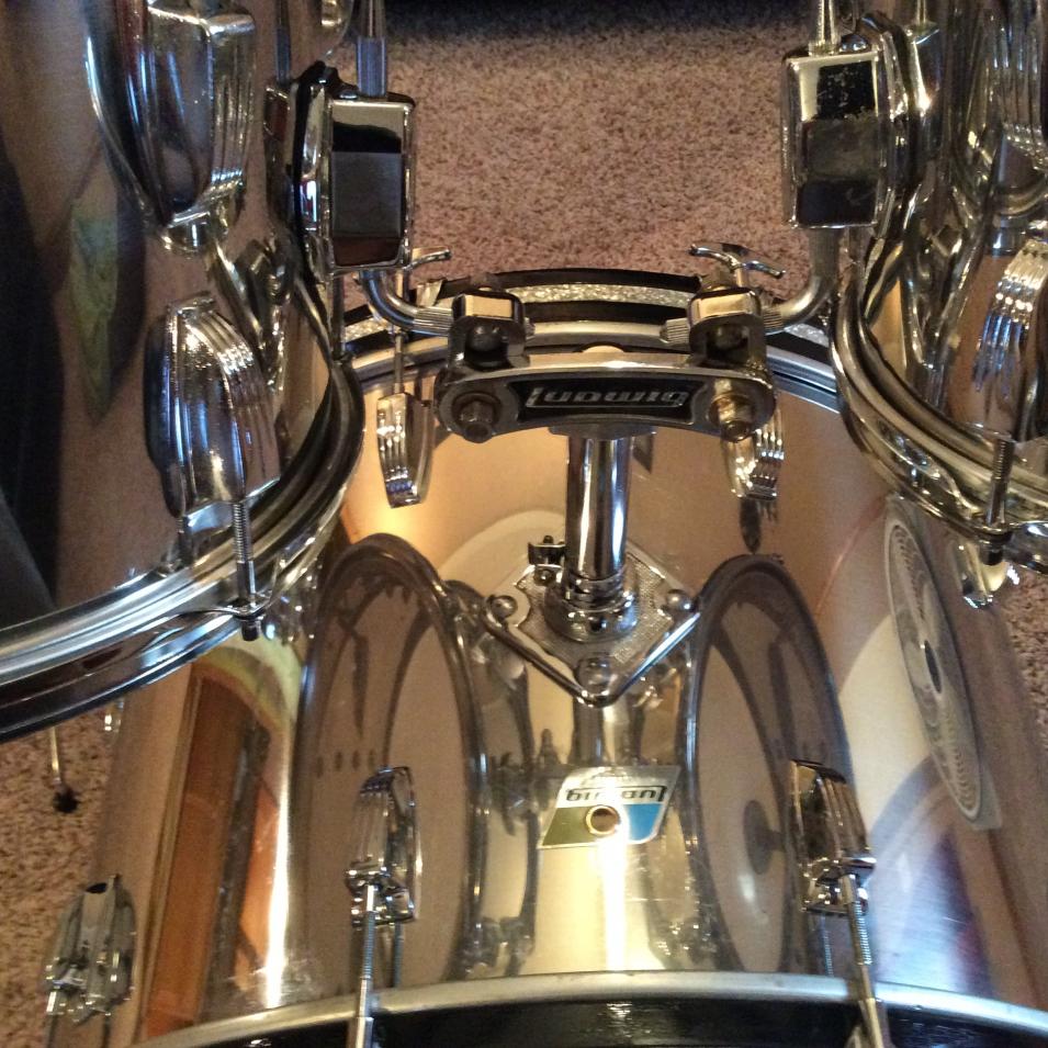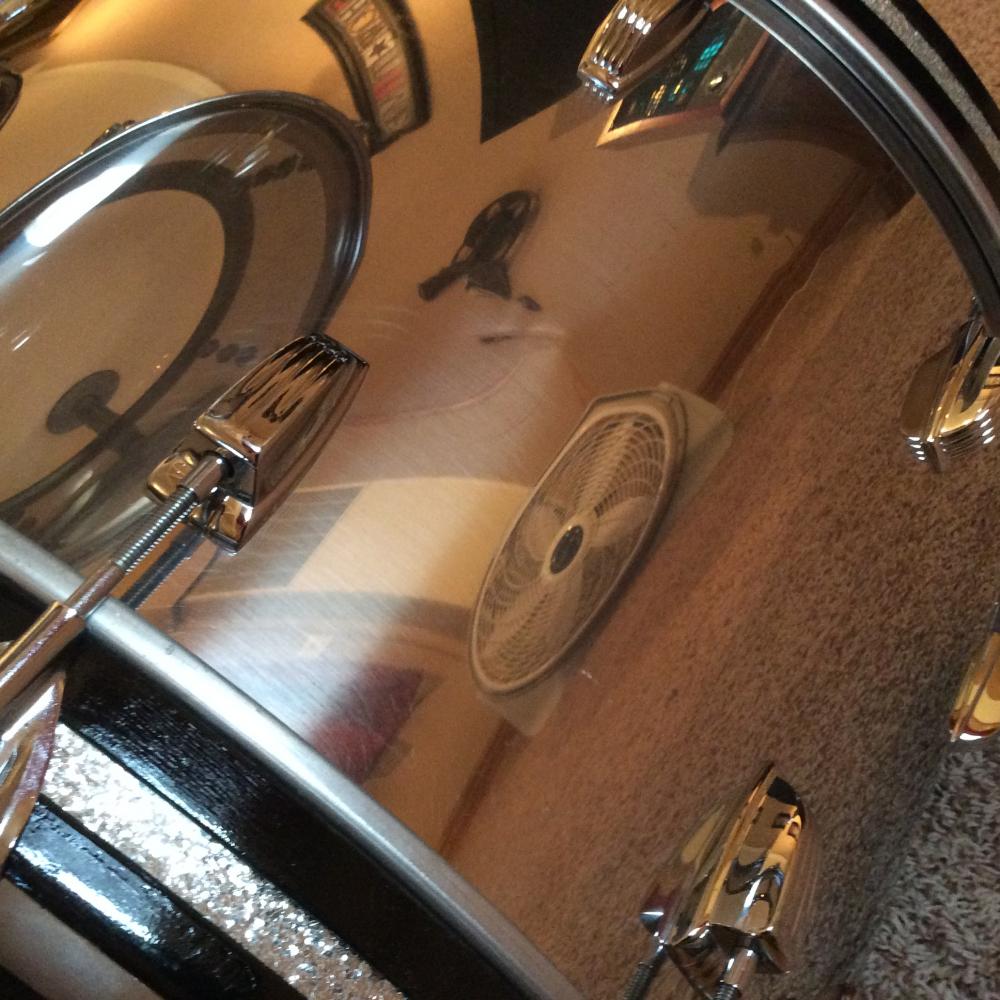 Some of the inlay is missing. Hoops have been repainted. Has a ding/dent/imperfection right below the 12" tom, which I believe was the cause at one time. The tom mount has been re-drilled oversize for a huge brass screw (photo). Has typical scuffs and scratches due to use and age. 5/16" spurs work perfectly with no issues of stripped threads.