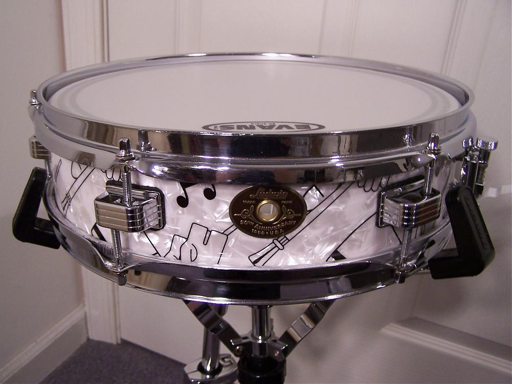 I am posting my 3 X 13 Jazz Combo snare from my 67 Ludwig Jazzette set. It was covered in the 90th Anniversary Top Hat and Cane wrap by Jack Lawton. I will post more pic's as I put this set up. I will be playing this set, that is the reason for the Evans heads. Let me know what you think!