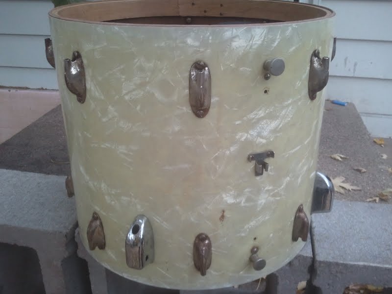 I have the 13" & 16" Toms. Both have their original top hoops with original tension rods and clips, as well as (2) mufflers per drum as well. The 13" is missing (2) clips & (2) tension rods. No bottom hoops or tension rods/clips for either drum. It also looks as if at some point someone added floor tom leg hardware, that is not original as it seems like this era used a cage stand to mount the floor tom.