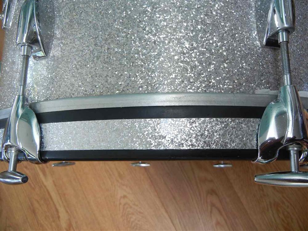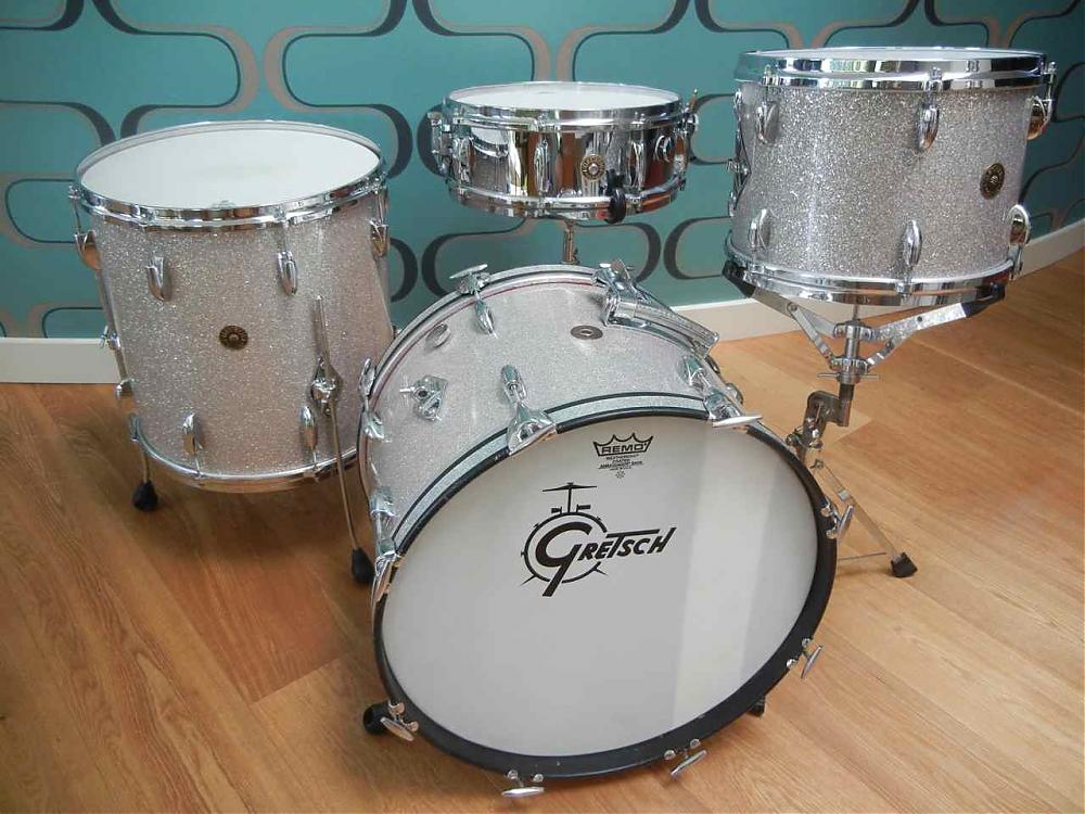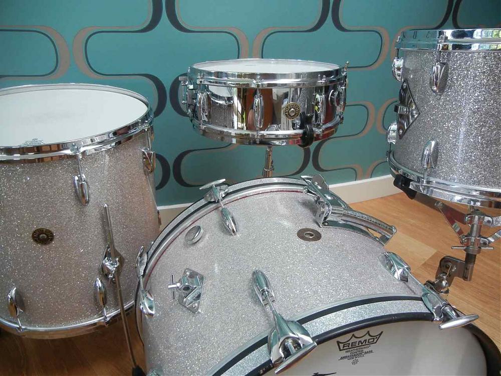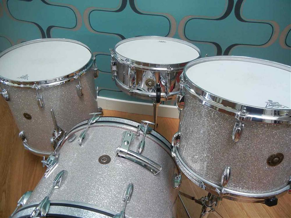 Anyway, the sizes of the Gretsch are: 20", 16", 13" and the finish is Silver Glass Glitter. All shells are 6-ply. Depending on the manufacturing date, I guess it could be a "Name Band" or a "Bop Outfit".