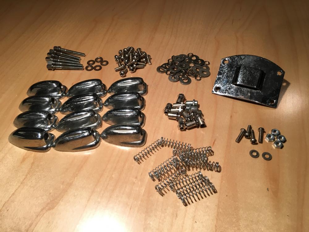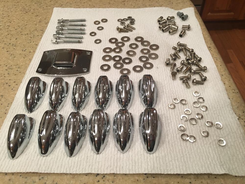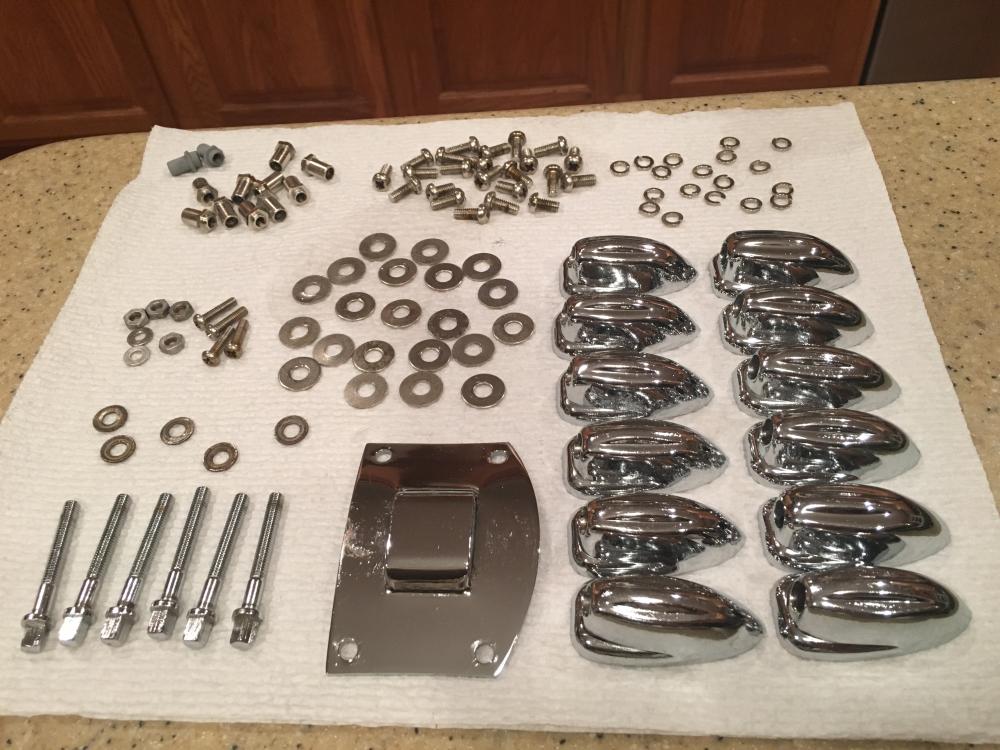 The hardware from the 13" spent the last 24 hours in a jar of vinegar, and tonight they were cleaned with a toothbrush, rinsed and dried. Other than losing two lug inserts (I'm no chemist, but I suspect they were made of a different metal than the others which didn't react well to the vinegar), I can't complain about the results.