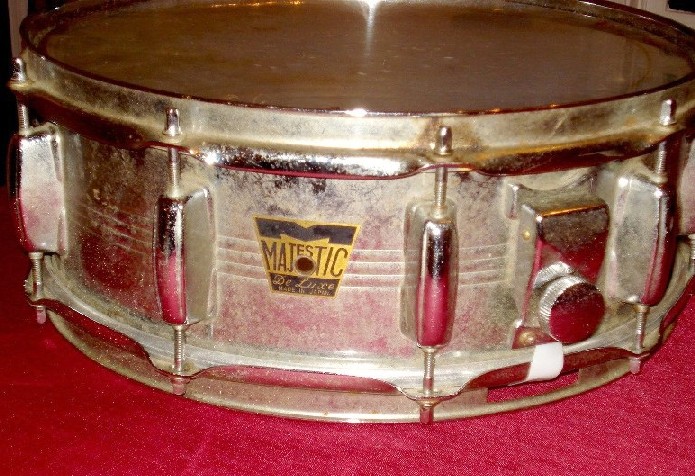 Just got this snare in exchange for resealing the lifted seams on an old pair of Ludwig concert toms. Any help identifying this particular vintage and lineage would be appreciated. I though Majestic was made by Star but the hardware doesn't make sense. The only Majestic I've seen had that common, simple lever strainer found on 90% of these MIJ snares. What's up with this strainer/throwoff and the strange tensioner butt mechanism? Could they be original or perhaps modifications?Sorry for the low res pics...[Attachment: 48670][Attachment: 48671][Attachment: 48672]
