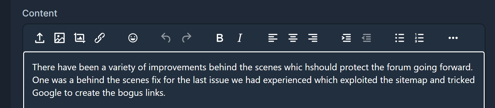 There have been a variety of improvements behind the scenes which should protect the forum going forward. One was a behind the scenes fix for the last issue we had experienced. The hackers exploited the sitemap and tricked Google to create the bogus links. It is more technical then that of course!