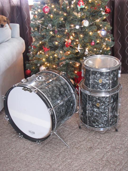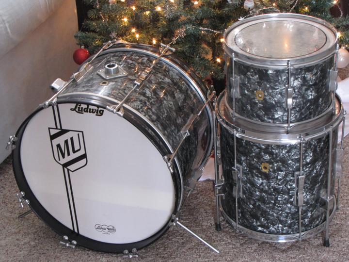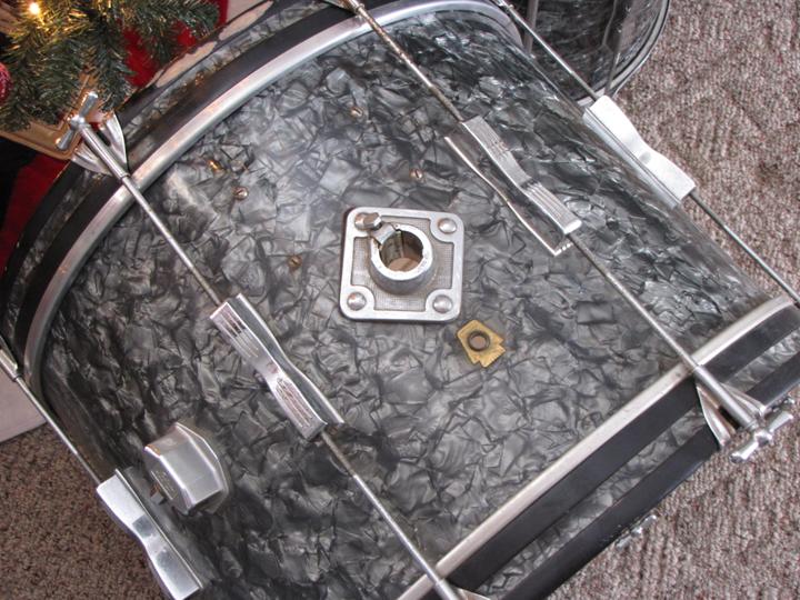 Picked-up a set of BDP Club Dates on Wednesday (12/22) as a little Christmas/birthday present for myself. I was actually responding to a local craigslist ad for a Ludwig green sparkle snare which turned out to be nothing (rewrap and missing parts) but the guy had this set sitting in the corner. So I asked if he would be interested in selling the set thinking he would not. Sure enough, SOLD! It isn’t perfect but everything is there and the wrap is in nice shape. Someone along the line removed the rail consolette and added a diamond plate mount on the bass drum; they at least did a nice job. The bass drum and mounted tom have the white painted interior and are close in serial numbers and date stamps (Oct. 23 & 24, 1967). The floor tom however, has the natural lacquered wood interior and the serial number is about 100k later than the bass drum and mounted tom. All-in-all I’m happy and can’t wait to get them shined up. As you can see, I’ve already added my “shield of approval” lol!