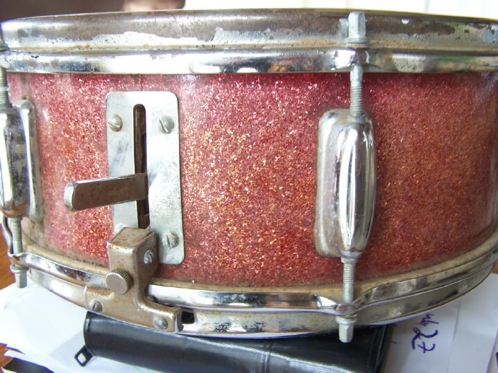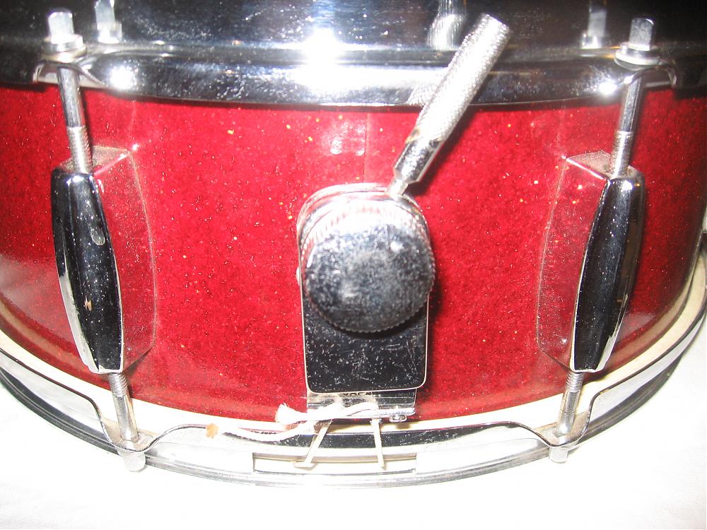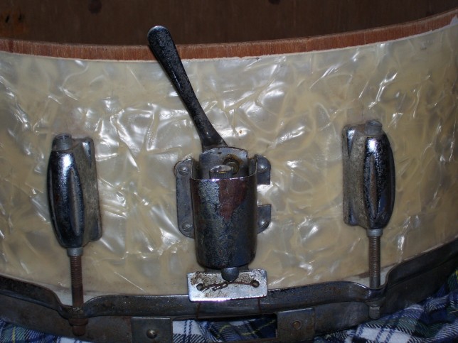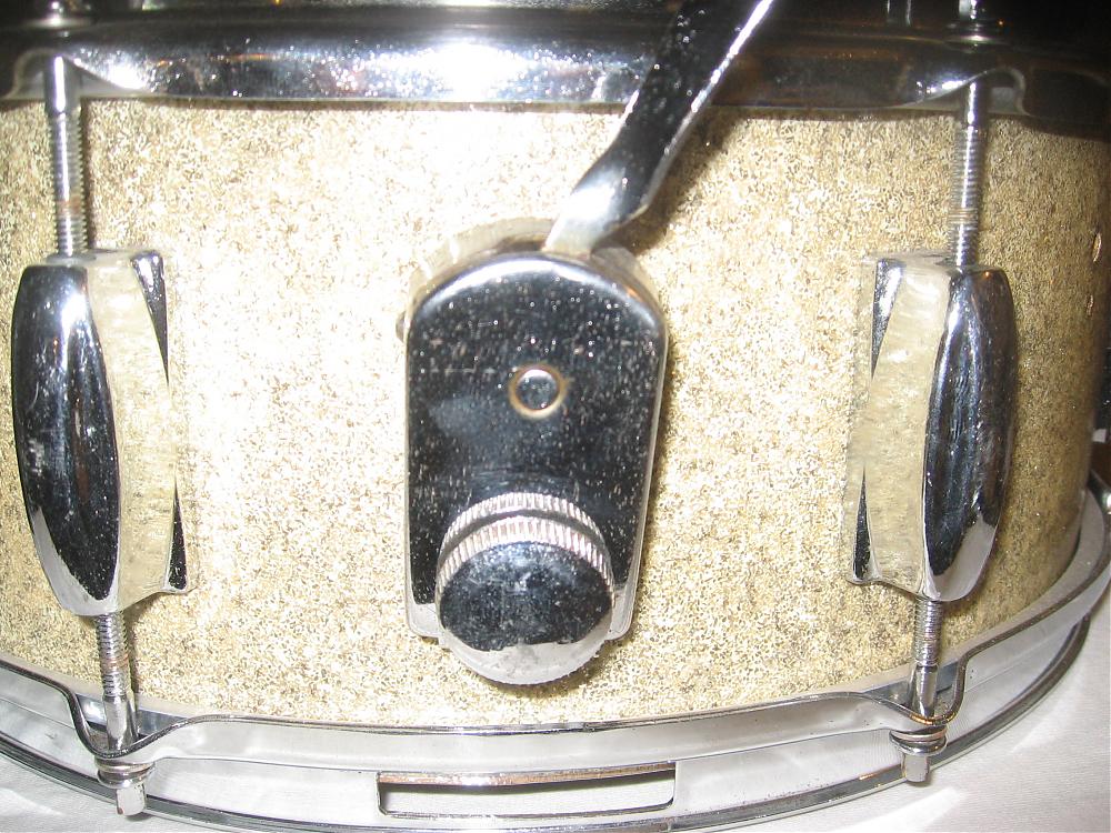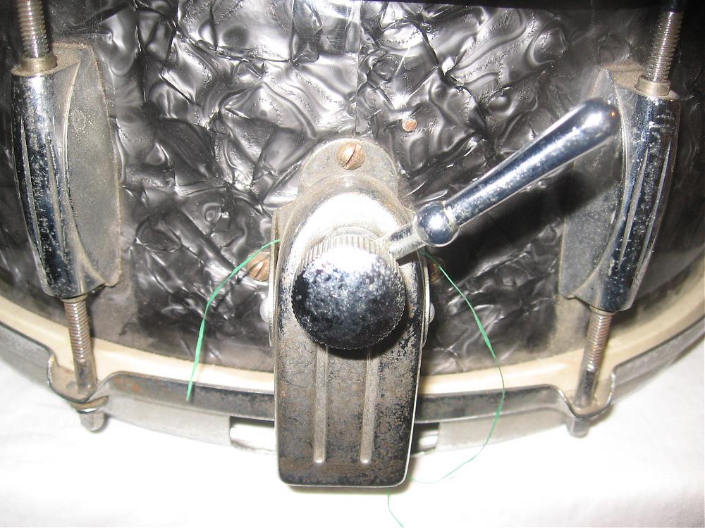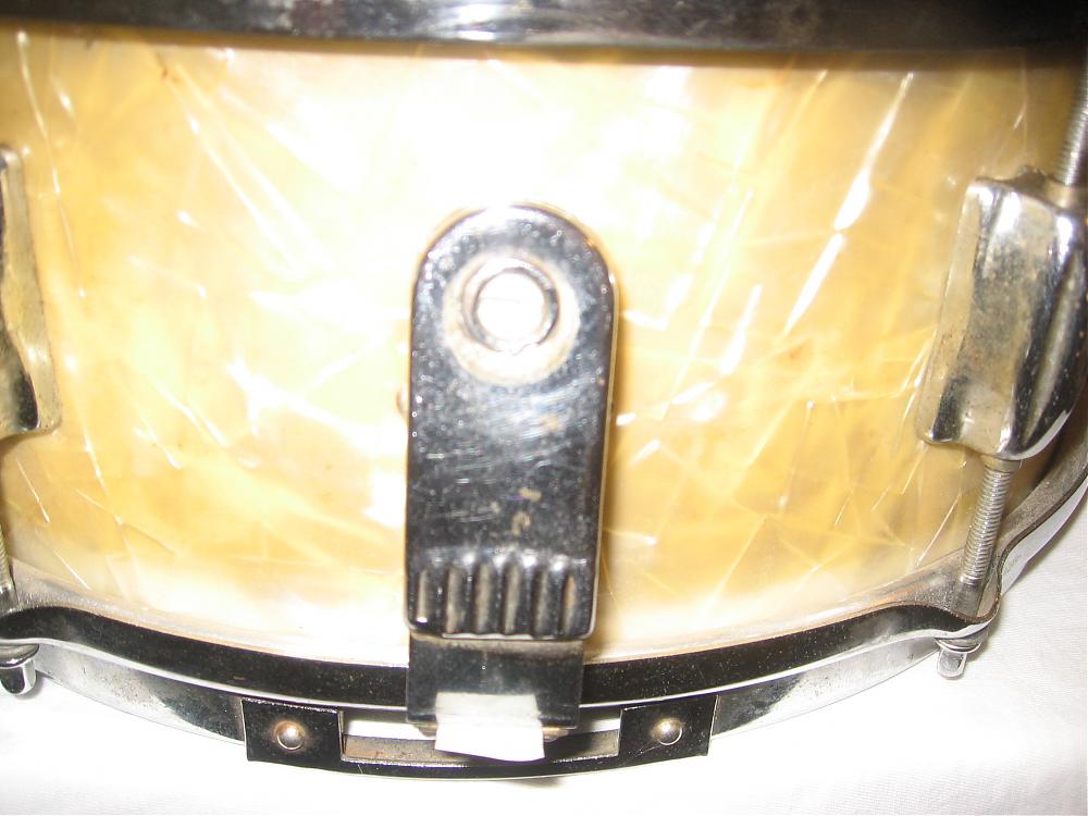 The 4 point strainer, above, in the first set of pictures, was last seen cataloged in the 1966 catalog. It is a an exact copy of a late 50s-early 60s Rogers student type snare strainer. Likely was discontinued because the throw arm is rather thin and easily bent. That said, it has a certain mojo that I like, I have 2 examples of this strainer, both work perfectly, holding tension as if it's life depended on it, although they are scratched pretty badly by who knows what.