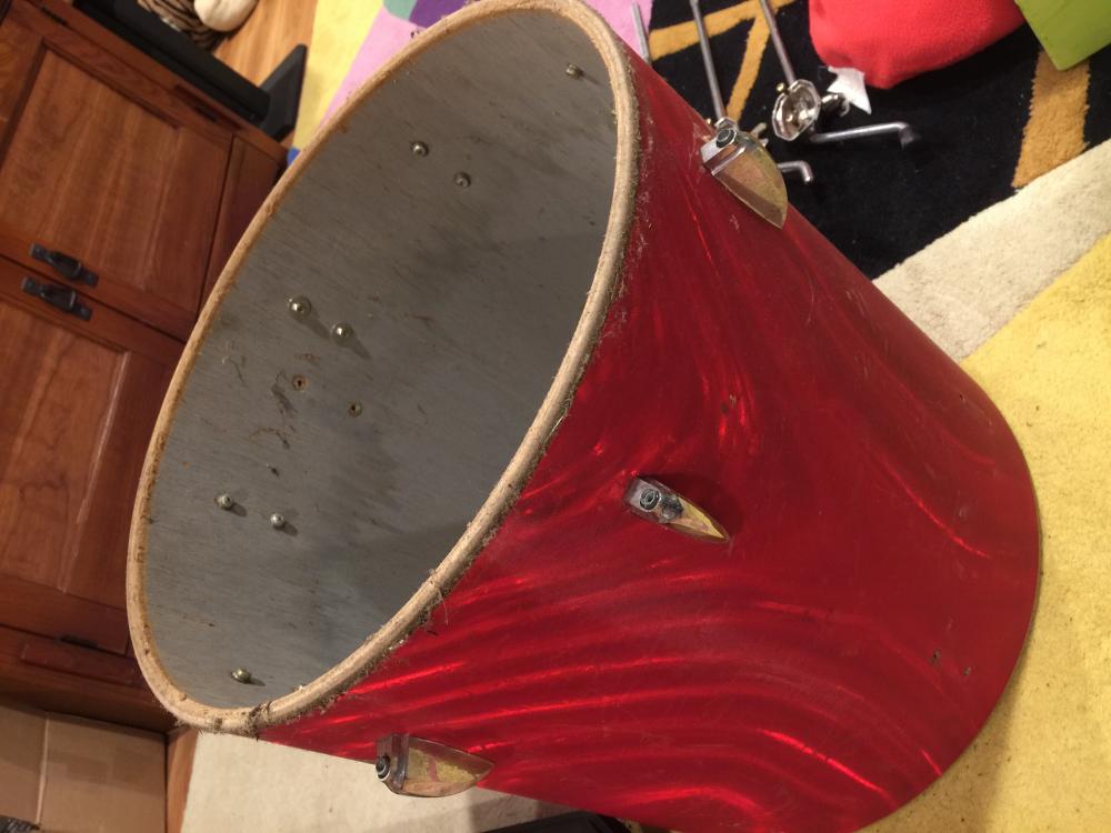 Here you'll see that I've disassembled the floor tom and have begun cleaning up the shell and the hardware. I may take to repainting the interior as there is some slight water damage. The drum was super filthy as you may be able to tell from the photo.