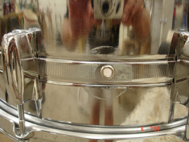 Hi everyone. Today I picked up this red sparkle kit off C.L. The snare looks like it may have had a badge at one time. The drums were advertized as a sixties Star kit. It has very simular lugs as the Stewart kit I bought last week. Although this kit came with a chrome snare, the Stewart kit had a luan snare shell. The wrap on this kit looks pretty good but there are a few issues. One of the toms has split in the wrap, I dont think that calls for a re-wrap job but I will need to figure out a repair for it. Back to my origional concern, anyone think that the snare had a round badge at one time? None of the other drums have badges, wouldnt they all have the same badge if they were origionaly sold as a kit?