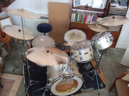 Snare Drum is a Ludwig 400 Supa – Phonic 14” x 5” alloy with P85 strainer, with B & O badge with rounded corners and serial No 2140756 (Purchased February 1981)