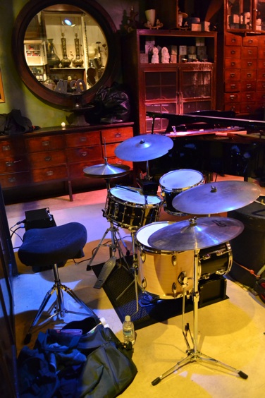 The kit is a 1975 Rogers 14" tom for a bass drum and a 12" tom attached to it via the genius design of the Memri-Loc hardware. The bass drum sits in a cradle that I made for it. The snare drum is a WorldMax Black Hawg...yeah, yeah, I know it's a Chinese-made drum, but hey it was a gift. I usually use a 1984 Acrolite, but on this night, I was trying something different....OKAY?! x-mas3 The floor tom is a King 13" tom from a Bopcat kit made by Buzz King (some of you may remember the Bopcat kit ads).