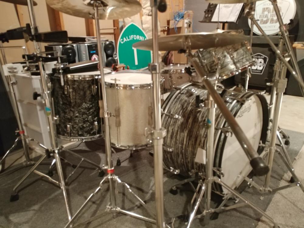 Just for fun I mixed up some drums from the three Ludwig kits that I am keeping 8x12 club-date in sky blue, 14x14" club-date silver sparkle floor tom, 16x16" black diamond pearl floor tom and a 14x22" oyster blue bass drum. And boy do they sound great!