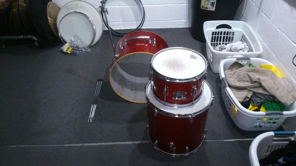 The floor tom is a double lug, and the wrap is a little more plum than red. The rack and bass have the familiar "Made In Japan" with the blue printing and star. The floor tom is unbranded. Curiously, all three interiors are different. The rack tom is natural interior with no re-rings. The floor is natural with re-rings. The bass is painted gray with no re-rings.
