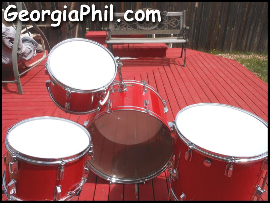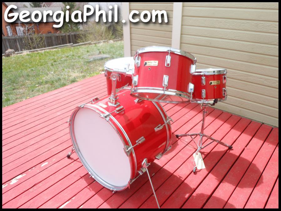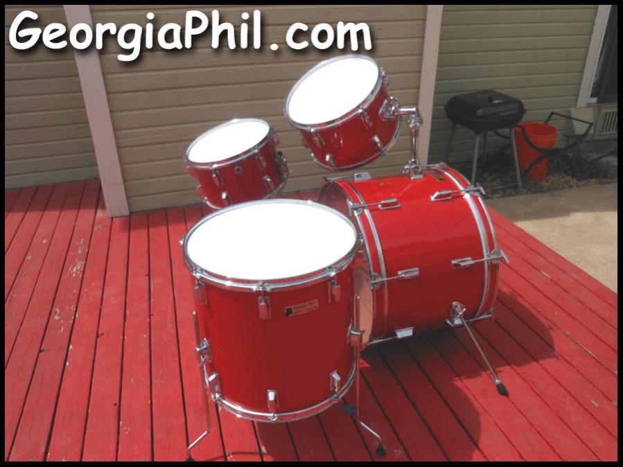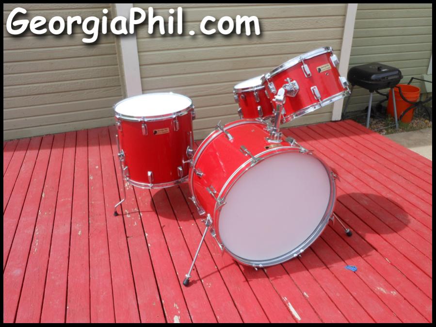 This is '70's era MIT, Luan wood shells. I recut the bearing edges to a double 45 on all drums, re-wrapped with a ruby red micro-sparkle wrap, and converted the 8x12 rack tom to a snare drum. Boy oh boy does it pop too.