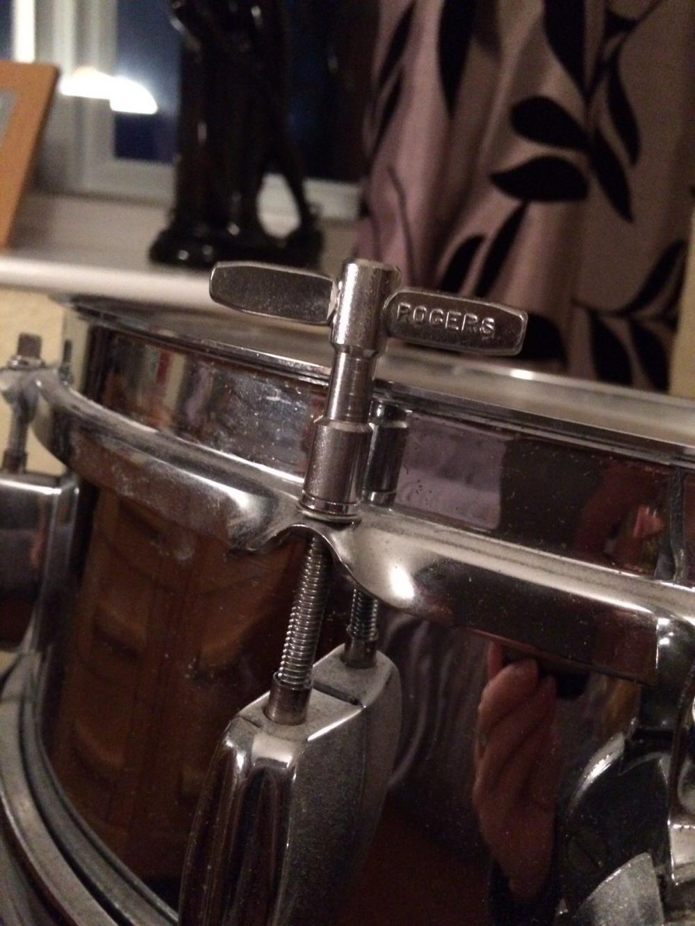 Hello.....Another great snare drum to the collection. Not sure of year. Its an English Rogers with COB shell and tall boy hoops. Cost me as a package £55 delivered. Just bought it from ebay in the UK comes with Rogers key and premier lokfast stand. The badge is missing but my friend nick hopkins has one for me so she is complete. Strainer and butt all original just hope lugs aint cracked. These are customer pics so once i get the drum its the usual strip down... clean.. then display. I also have an original rogers drum head which i knew one day would come in handy....sean