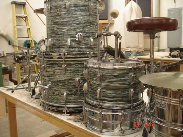 Saw an add on C/L today at 9:00 AM, emailed the seller and drove about 100 miles one way. Gave the nice lady her asking price because the drums are worth more than I gave her by a longshot. Got home at 10:00 PM and took these pictures. Im so excited, always loved Ludwigs Blue oyster wrap. I think I saw a date of 1965 but not sure. Keystone badges have numbers, baseball bat mufflers and white painted interior with rings. No holes, a spec of rust here and there. All origional, no missing parts. These will be set up in my office as soon as I clean them up! Lucky day indeed.