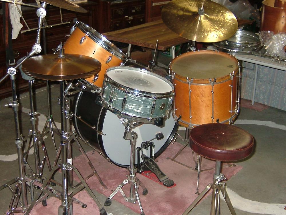 That set's mojo is off the charts. Love that field drum. I'd totally love to put together a custom kit with a bare wood finish, tube lugs, and claws like those. What's the cymbal above it?