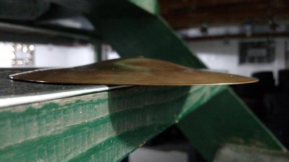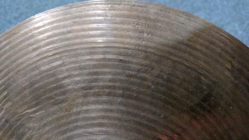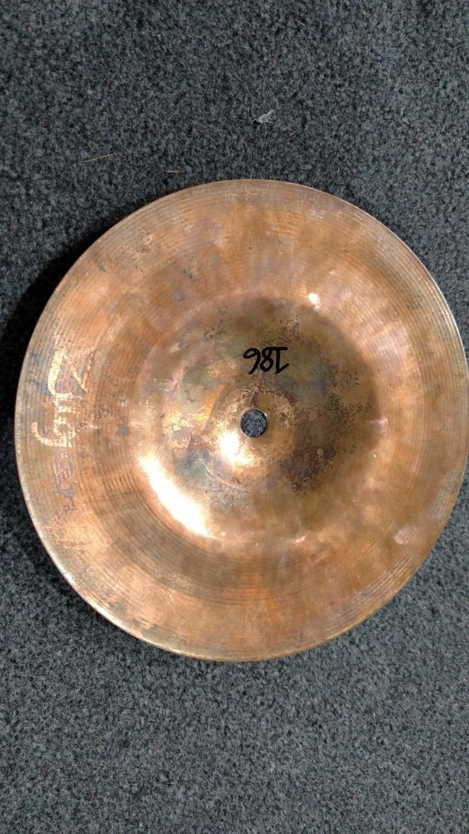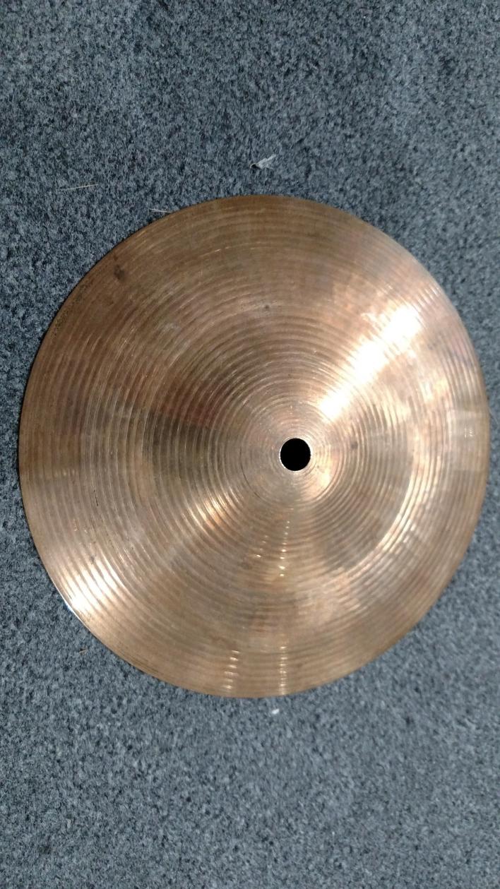 -I thought by the odd/flat shape of the bell and profile that it might have been cut down from a larger cymbal. The visible stamp disproves that (it would've been cut off if it started out larger). Also, the ghosting of the Zildjian stamp on the bottom is too "perfect" to be hand done. Finally, the edges are perfectly smooth and it is cut perfectly, so I think it's always been an 8".
