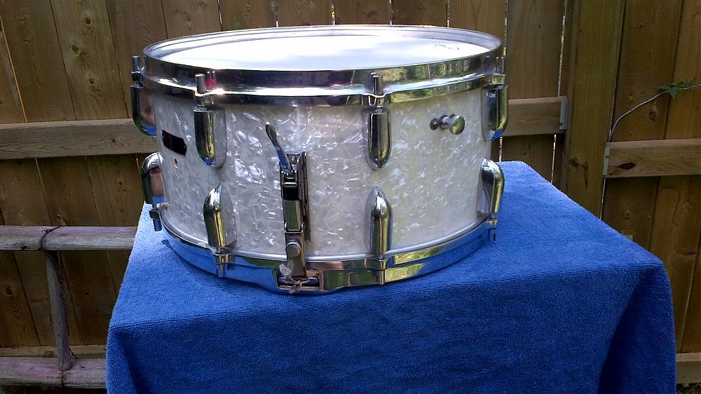 Here is a '40,s or '50,s Beverley snare that has one of those little celluloid badges. All seems original; even the full width 16 strand carbon steel wires. Nice; long cast arm on the throw, muffler and engraved cast hoops. The badge looks like it was stamped from black wrap. It would have been cool if pearl or sparkle ones had been available too! 14 x 6, 3ply mahogany and birch shell.