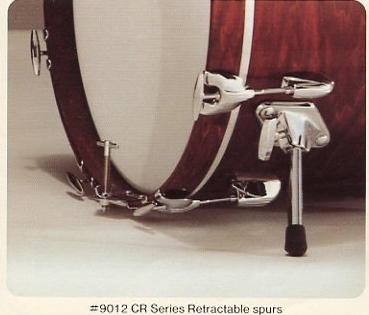Below is a pic of the drum I bought, along with a pic from the 1982 Gretsch Catalog that shows the exact type of Gretsch disappearing spurs I'm after, Gretsch Model 9012 CR Series Retractible Spurs.