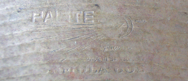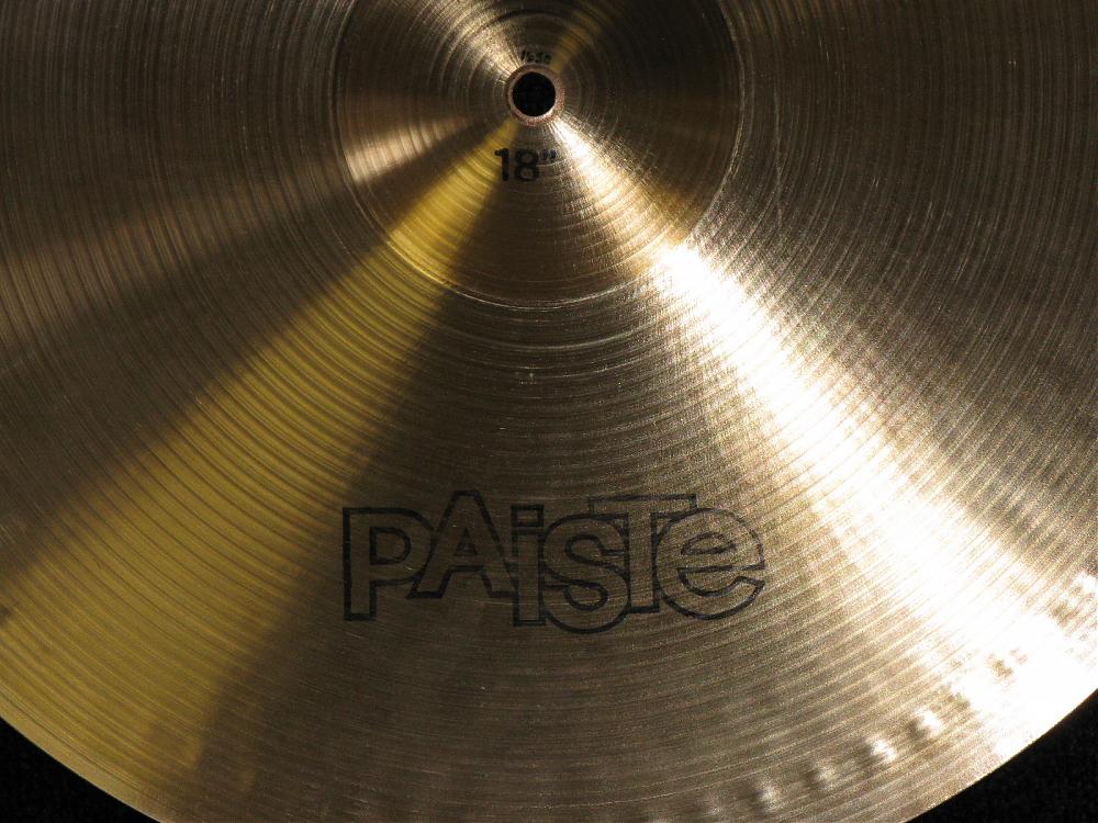 Here’s a photo of a Paiste 602 found in the back of a music store. It has the embossed logo, black ink Paiste stamp & size, and red inked cymbal type.