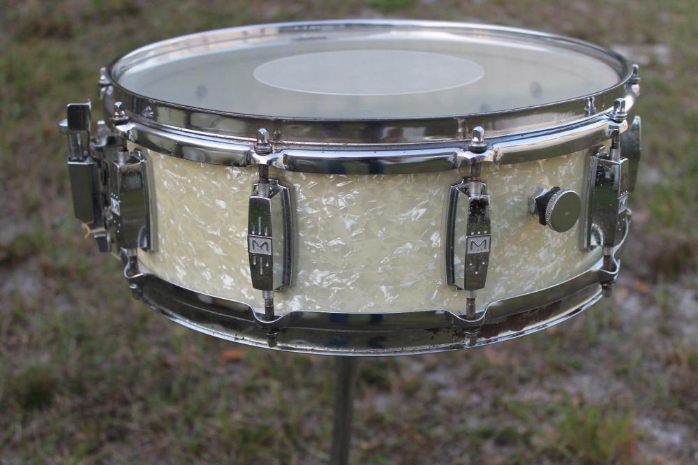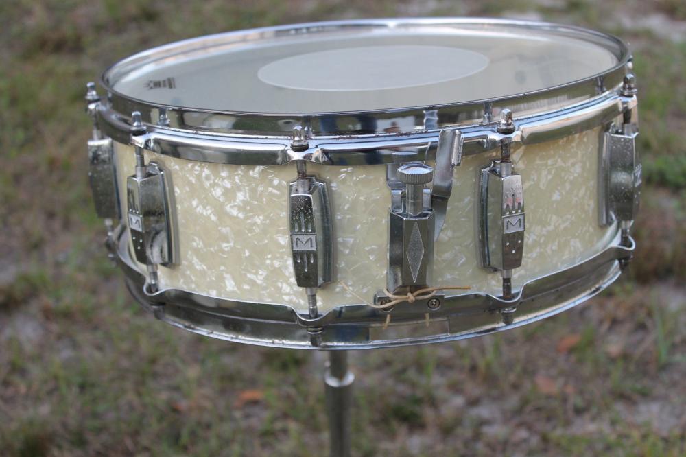 5.5" x 14" snare drum - Has 10 lugs, 20 tension rods.What look to me to be Ludwig rims. ( rims have some chrome loss) Replacement strainer ( no extra holes drilled) Looks like a Slingerland butt. Has a Ludwig baseball bat muffler using a knob instead of a bat. ( pretty cool ) 3 ply shell with rerings with factory white painted interior. Comes with 60's Slingerland snare stand shown in pictures