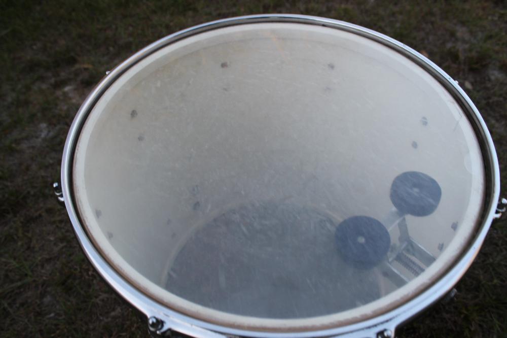 9" x 13" tom - Has 12 lugs, tension rods.What look to me to be Ludwig or Rogers rims.early diamond plate tom bracket. Has a Ludwig baseball bat muffler using a knob instead of a bat. ( pretty cool ) 3 ply shell with rerings with factory white painted interior