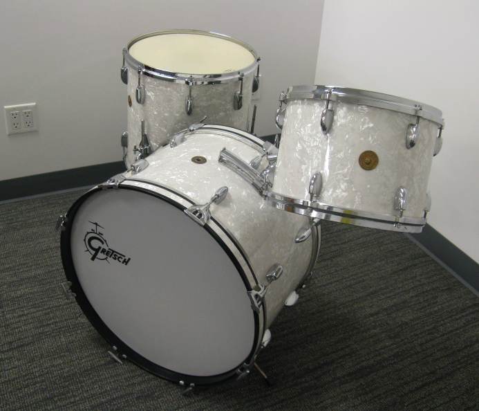 The other was a rescue job. I bought this 60's Gretsch Round Badge kit (22/13/16) for $100 from someone who had painted over a satin flame finish with red paint. After many months of cleaning and removing paint, I was able to get the hardware back in shape but the red paint was stuck in the cracks and spiderwebs of that old satin finish. I lived with it for a while but it looked pretty crappy so I finally caved and rewrapped them. While no longer a collector's kit, it's a pretty sweet player's kit for a hundred bucks and a lot of elbow grease.
