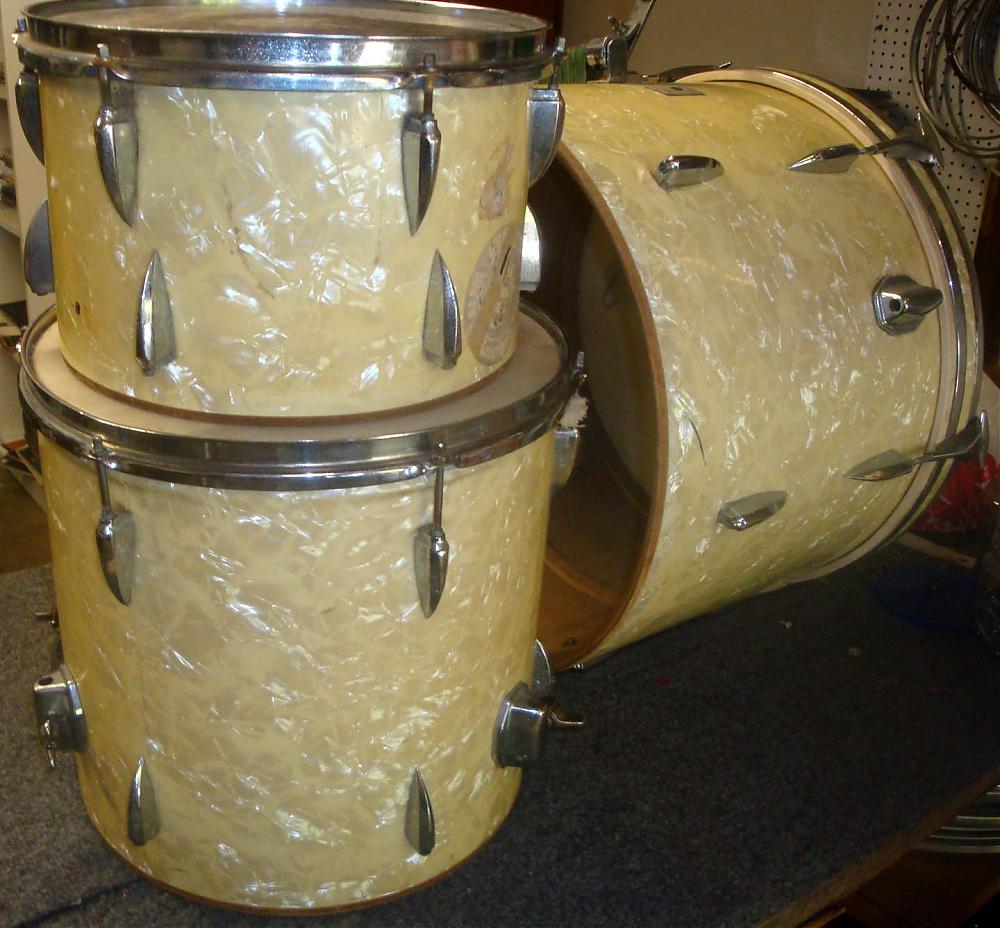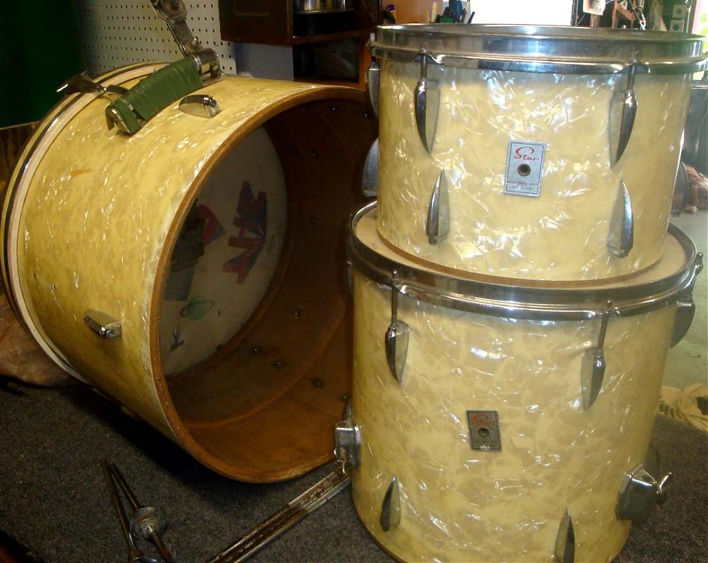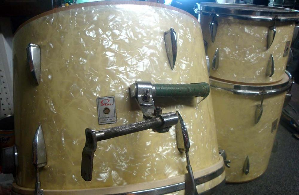 Hey guys, I just rescued this lovely finish old Star setIt's missing 3 Shark tooth BD lugs, The T's and claws for one side of the BD (6 each) and the tension for the bottom hoops on the 12" and the 14" (I do have the hoops). I don't need it but I'm tempted to keep it because the finish is just killer ...If someone has the snare and wants to get rid of it please let me know. Now, if someone wants the set I might trade it for any interesting vintage piece...Im looking for a lot of stuff so you never know...In the meantime comments and compliments are always welcomedVinny