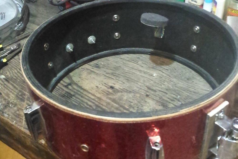 I actually started putting edges on the snare tonight. But I got some photos of the non edges before hand. Where the snare strainer attaches had a slight crack in the wood. So I took two small pieces of wood ( one interior,one exterior ) and glued them onto the shell and used tack nails once the glue was dry.
