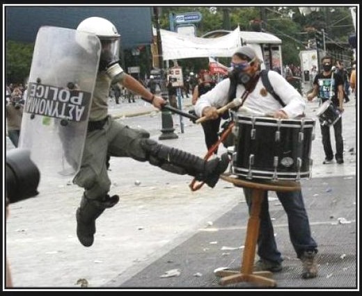 I knew the Greek police riot squads had little respect for protesters, but why take it out on a fine old bass drum? :eek: