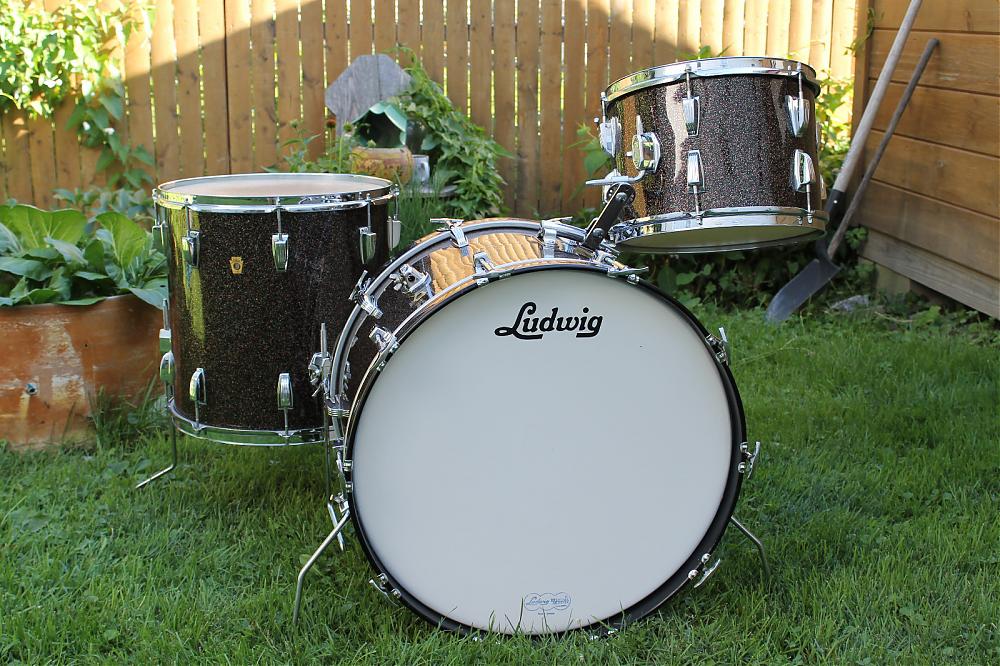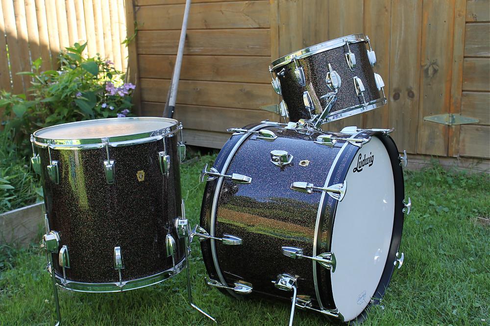 RARE" 1 OF A KIND ! 1965 LUDWIG BLACK GALAXY KIT. 22,13,16 DOUBLE BADGED B.D.