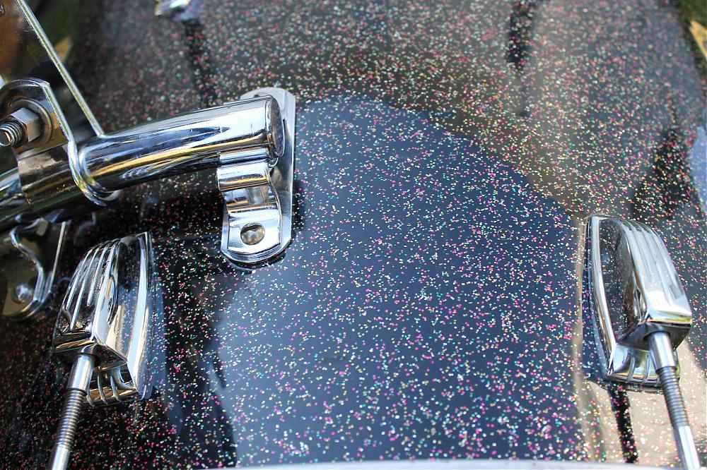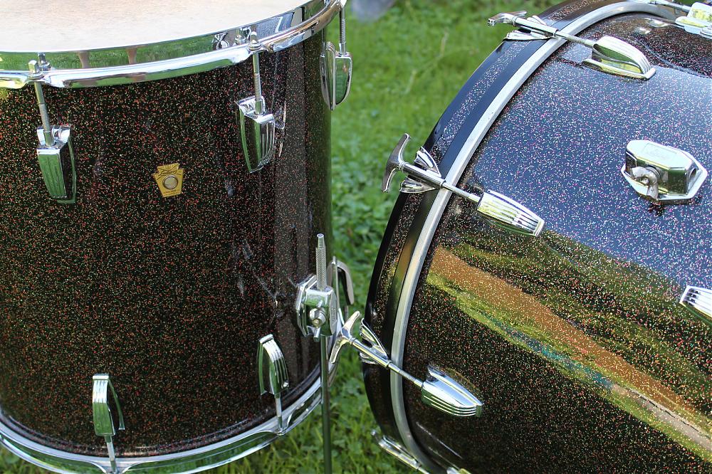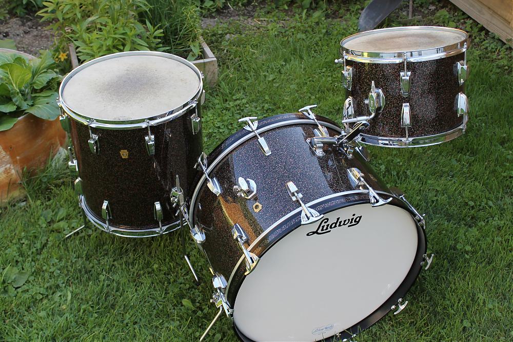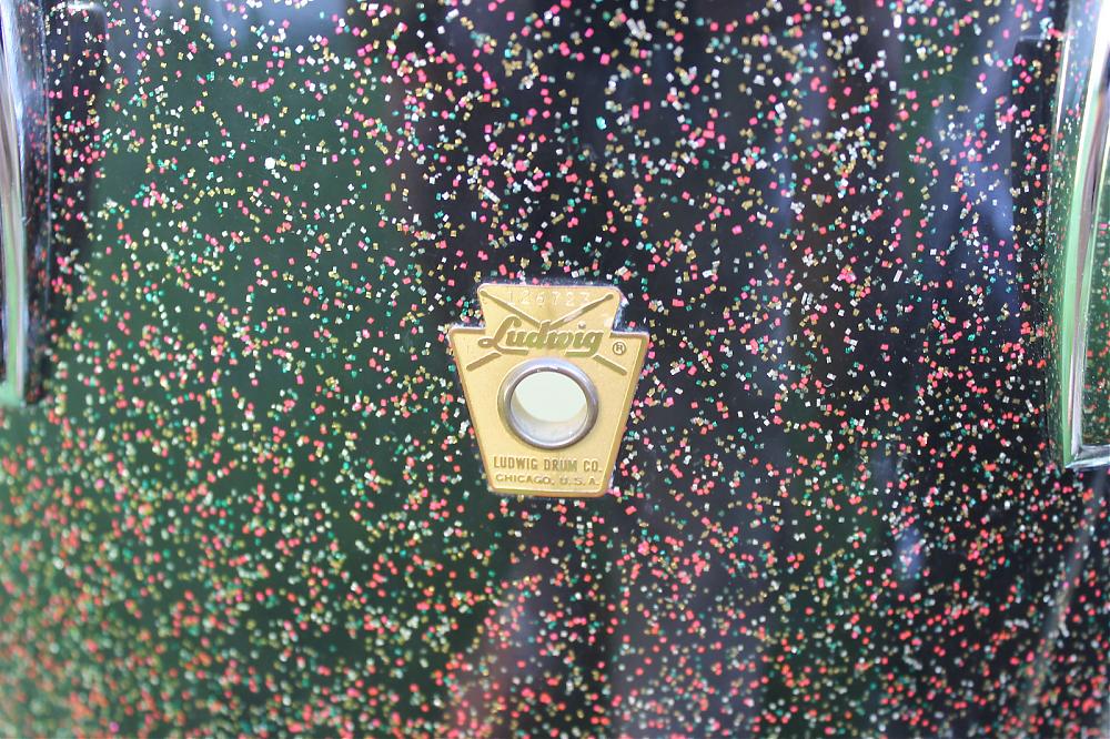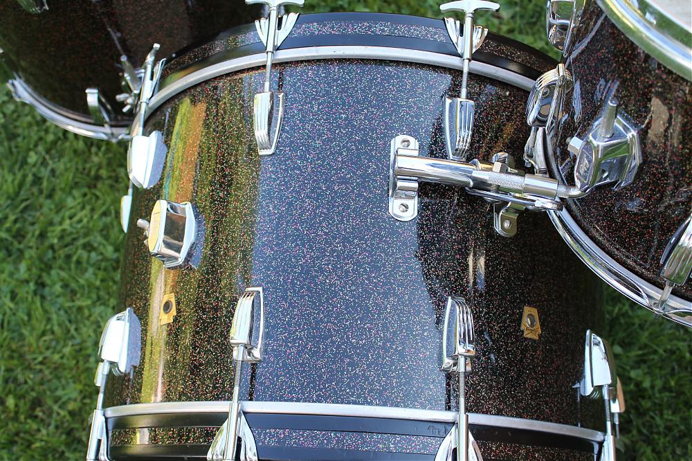 THIS IS A RARE 1965 LUDWIG BLACK GALAXY KIT. ONLY ONE LIKE IT IN THE WORLD. BASS DRUM HAS TWO BADGES. THIS IS DONE IN THE LUDWIG FACTORY. ORIGINAL !THIS IS THE ONLY DOUBLE BADGED KIT IN THE WORLD.( SEE PICTURE # 3 ) ALL ORIGINAL KIT WITH CORRECT ERA HEADS. (MAY BE ORIGINAL HEADS) ORIGINAL BLACK GALAXY FINISH IS IN EXCELLENT CONDITION WITH ONLY A FEW MINOR MARKS HERE AND THERE FROM USE. SOMEONE HAD DRILLED THE TOP OF THE BASS DRUM TO MOVE THE RAIL CONSOLATE OVER TO THE CENTER OF THE DRUM. THESE WERE SMALLER THAN FACTORY HOLES. ABOUT 3/32" . THIS WAS REPAIRED BY A PROFESSIONAL WHAT A JOB.! HE DID AS CLOSE TO AN INVISIBLE REPAIR THAT I HAVE EVER SEEN. YOU CAN STARE RIGHT AT IT AND YOU CANNOT FIND IT. REPAIR WAS DONE WITH ORIGINAL BLACK GALAXY FROM A DONOR DRUM. (SEE PICTURE # 8 ) REPAIRS ARE ABOUT 3" TO THE RIGHT OF THE RAIL CONSOLATE SCREWS. REALLY NOT EVEN AN ISSUE ANYMORE. PERFECT JOB! DATE STAMP INSIDE READS JULY 23 1965. THE 65 IS BLURRED.