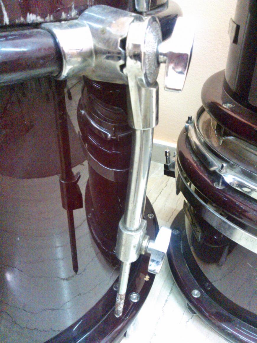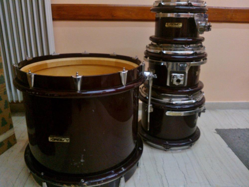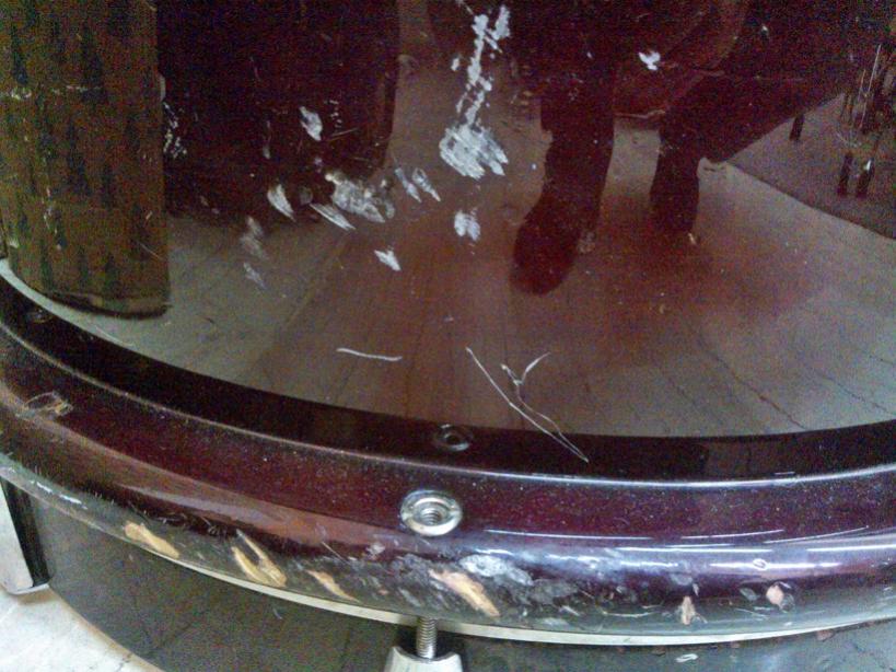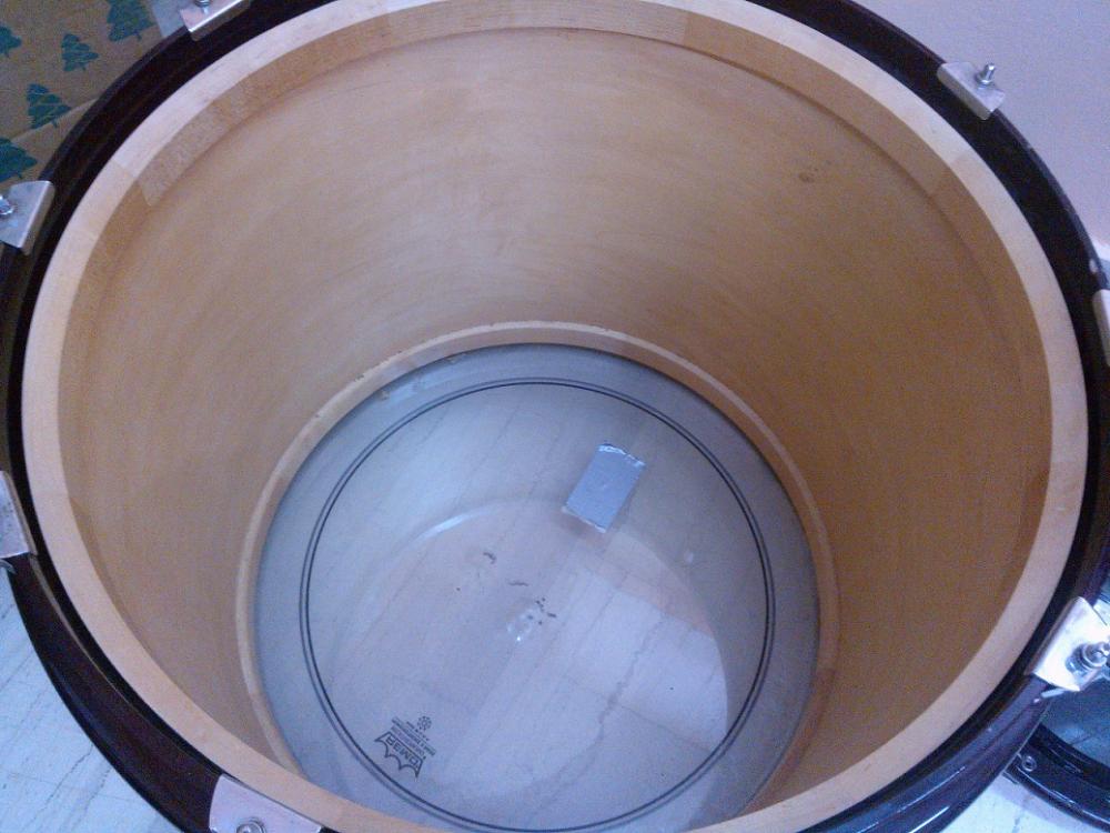 It' s pretty messed-up, so full of dirt and grime it almost looks like caked mud, but it's all there: 22"x18" BD, 10" and 12" TTs, 14" FT (all on Puresound rims) and a 14" snare - the whole kit weighs a ton. No hardware, the BD and the snare are missing their reso heads, no rubber feet, the rest seems pretty much OK. The badges are actually stickers that read 'Radial-Pro 1000'. I take a closer look, and that's some fine maple that looks back at me if I'm any judge. The guy there says a friend of his is coming to take it away cause he doesn't need "that piece of junk". So I give him $200 (which he grabs, thinking he's getting the better of me) and load the 'junk' in my car. An hour later (and after some very gentle cleaning), here it is.