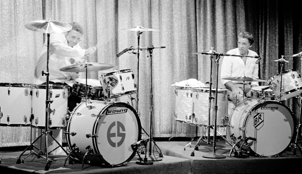 ... here are a couple pics out of my collection: The drum battle between BR and Ed Shaughnessy on The Tonight Show in 1978 which shows both their sets with the PRE full production Modular tom mount .. and .. a still I grabbed off the Buddy Rich Up Close DVD in 1982 showing one of, if not the, last set Buddy had just before leaving Ludwig for good, meaning never to play them again. Actually, to be completely accurate, Buddy and Ludwig OFFICIALLY parted ways in 1980!, but Buddy continued to play his Ludwigs through 1982, but without an endorsement deal!