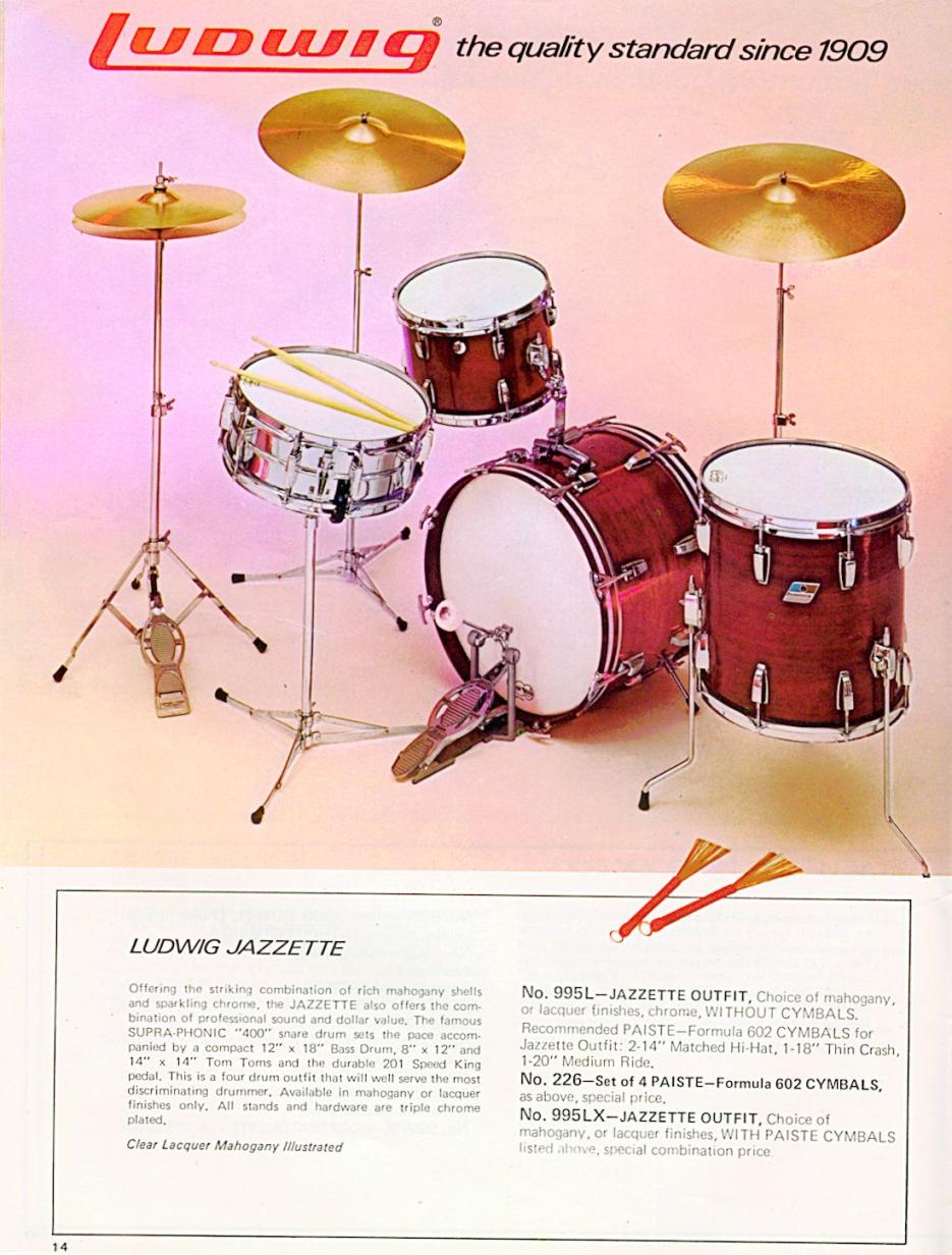 Show me the 1968,1969 and 1970 catalogues now. Oh, wait...There are none. I contend that Ludwig did decide to make wrapped finish Jazzettes in '68-'70....but since there wasn't a catalogue to show it, it's just my contention. But, as I say, technically, no one can say what Ludwig might have done in 1968,1969 and 1970 -catalogue reference-wise.