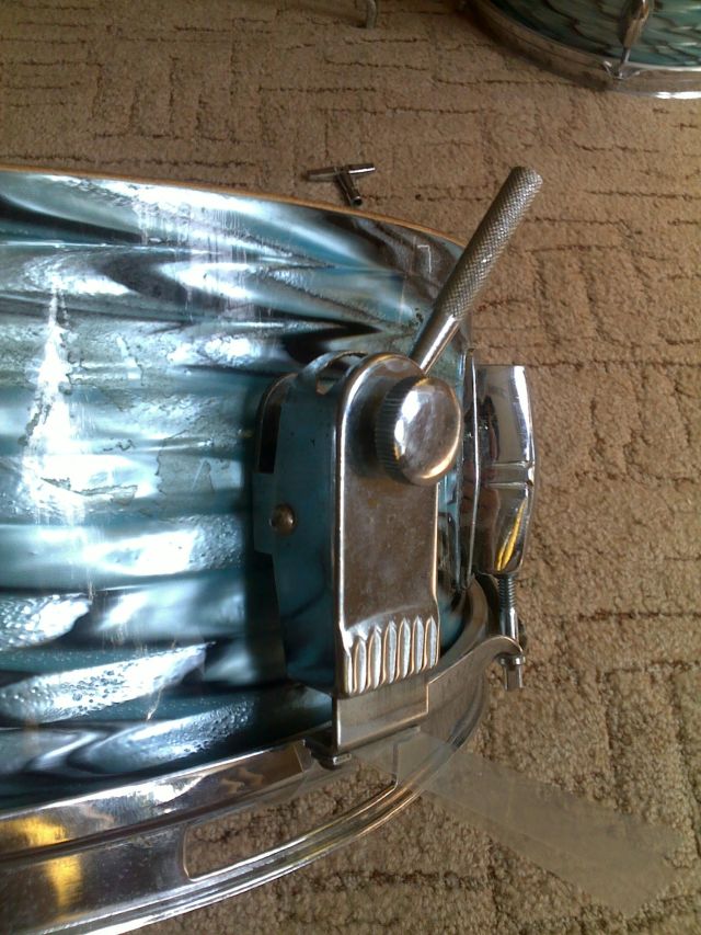 Very clean! Late 60s early 70s kit. Is the bass a Star? It looks to have Star T-rods. This color is called Blue Willow, or there was also another name for it, Blue Thunder? This is era specific as to the actual name of the wrap color, but it is in this timeframe. These are in excellent condition from the photos, but you need to put some feet on the floor tom. Pearl free floaters are the best for these old wood types, it increases their resonance. What sizes are they? That would also help in determining what "model" the kit is. What is stamped on the badges?