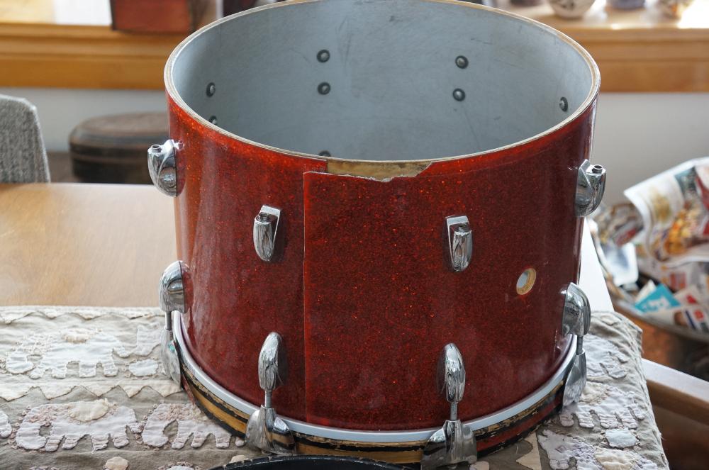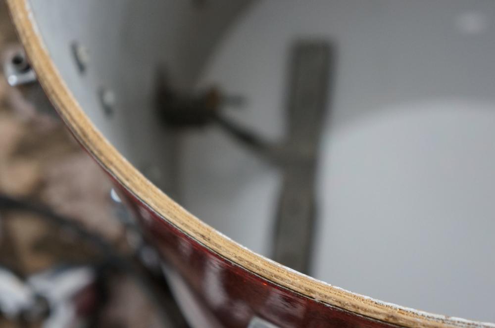 -original wood hoops, lugs - wood hoops have small nicks from use and are missing most of the inlay.