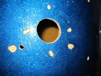 I'll still be on the lookout for a Gretsch Blue Sparkle Shell with NO extra holes, and when I find one, then I'll transfer all the hardware and have a perfect bass drum. But untill then, this will suffice for me nicely.