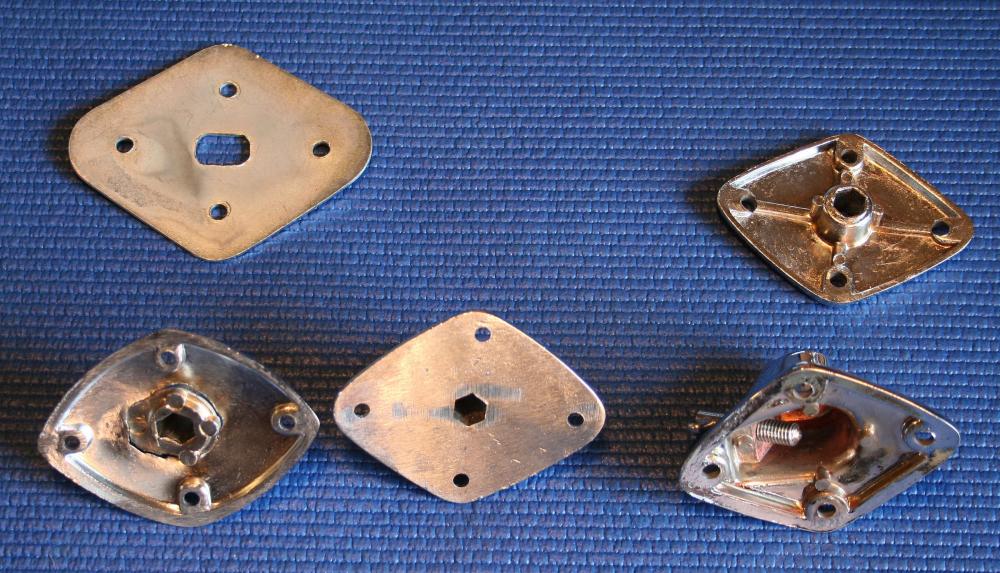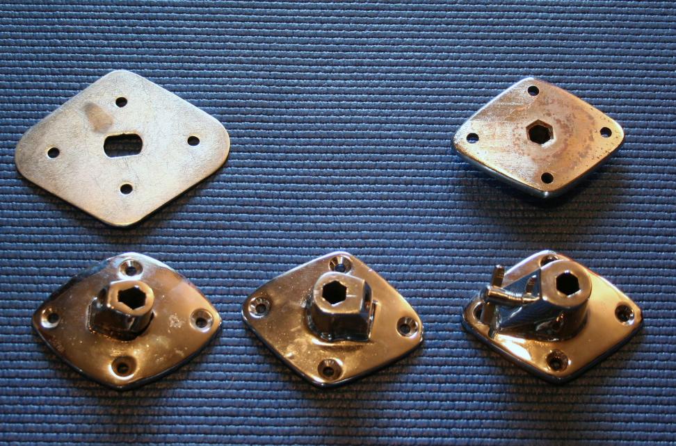 I forgot I had these pictures. I took them to share about a year ago. I had a broken hex style tom holder on a late 60s early 70s Pearl bass drum. Took me quite a while to find a replacement. Notice that there are 3 different styles/builds of the same mount. No, the holes do NOT line up exactly.