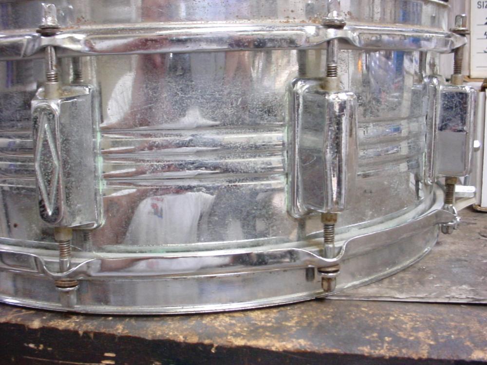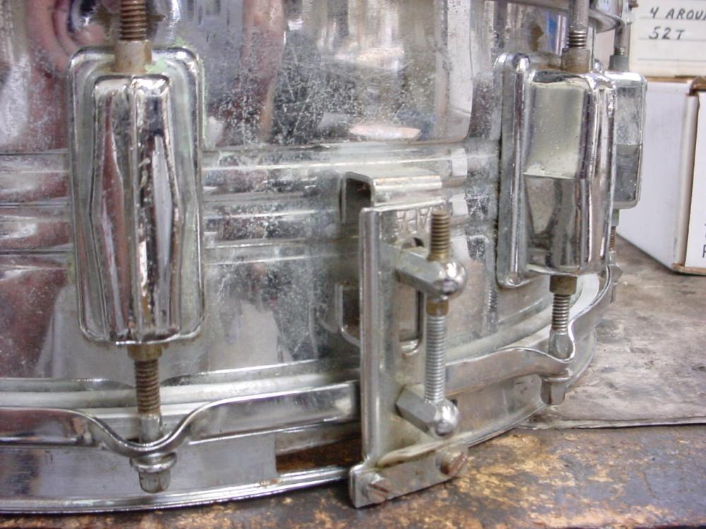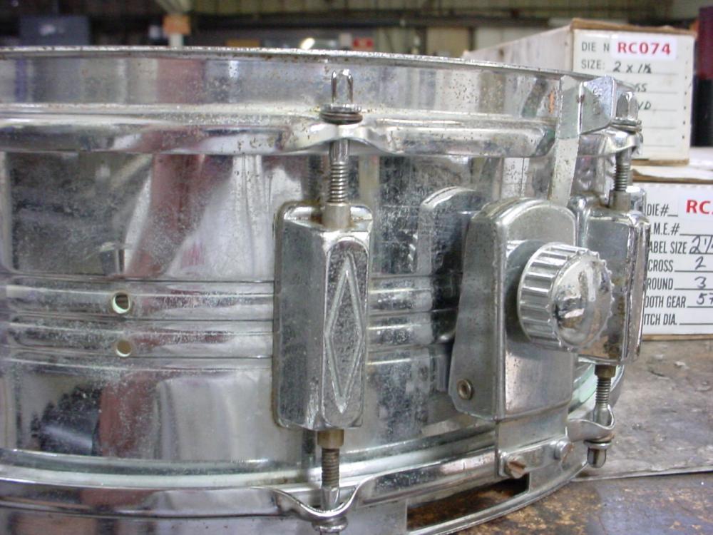 I picked up this Pearl snare pretty cheap on ebay. I was curious about the year, I saw in the '69 catalog a similar snare with the same throw, but only 2 ribs. Then in '70 the same 3 rib, but a Gladstone style throw. Two of the lugs have the diamond embossed in them. Looking forward to playin this one:)