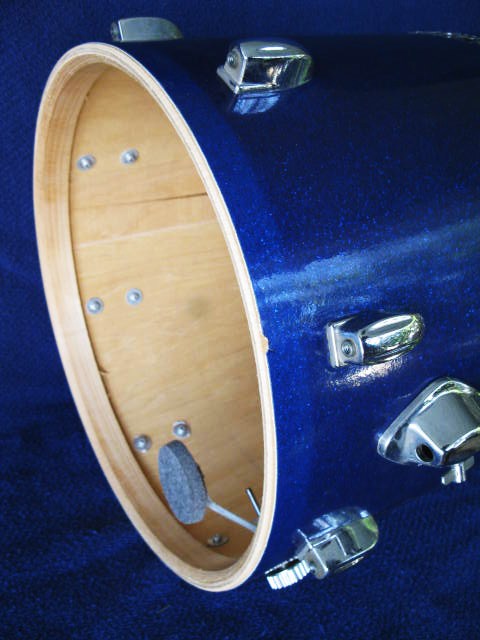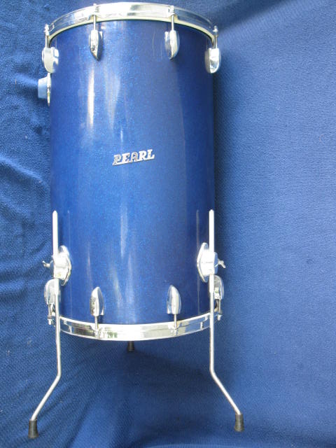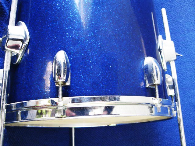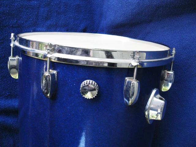 This Sparkling Blue Pearl 24 X 14" was found in excellent cond, w/ original unplayed heads. I was surprised to find it did not have an internal snare mechanism, (making it a Bass/flr tom combo). The 1968 catalog does not make it clear if the Cocktail set is bought complete w/ a long list of accessories, or if each item is an individual option. It implies that an internal snare is part of every Cocktail drum. (I would like to have that snare sound).