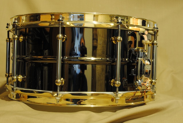10 tube lugs with gold plated ends, gold plated Pearl Super Hoops top and bottom. Throwoff and butt have gold accents. Shell has some blemishes but is perfectly round, ditto for the hoops.