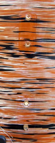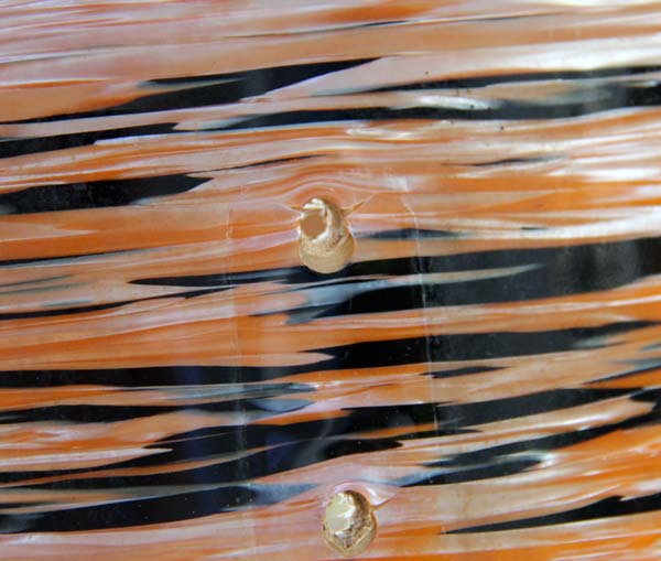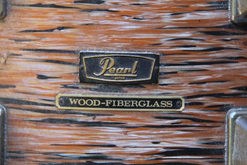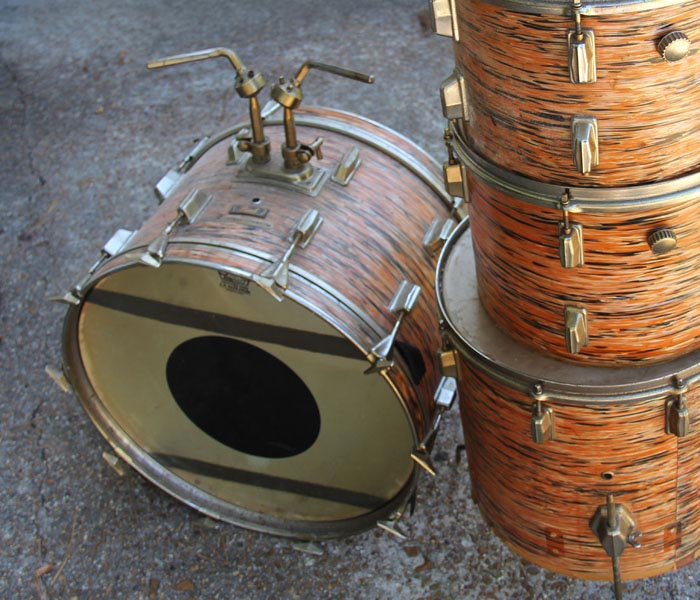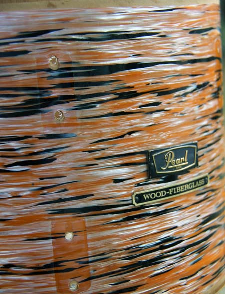 Of interest is the fading in the wrap, which is highly uneven. You can see in the pix below where I've removed the lugs from the 14" tom that where the orangey color was predominant the fading is severe, but where the other silvery black is there's not much fading at all. The wrap's not torn anywhere but it has shrunken over the years and there's a slight pucker at the end of each lug and around the holes where they mount. Tough stuff overall, though.