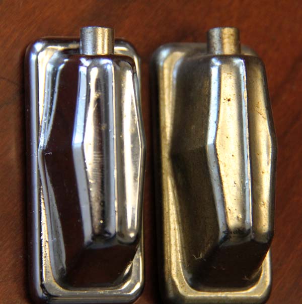 Progress report: I've been working on my Pearl Wood-Fiberglass kit as I have time in the evenings and have gotten a good bit accomplished. I decided to start with the hardest drum, the kick, which had the most hardware and square footage to clean. i was lucky in that no lugs broke as I removed them since they're larger than the ones on the toms and I couldn't swap them around. The hardware was in great shape structurally and poor shape cosmetically (see side-by-side pix above of a couple of lugs I removed from one of the toms). I took the lug assemblies completely apart--screws, washers, lug casing, threaded insert to receive the T-rod (what's the name for that piece?), spring, and styrofoam cylinder--and soaked the casings and inserts in warm, soapy water and the screws and washers in vinegar. Wow, what a good trick! Happy to have learned about that before this project. The vinegar dissolved the worst of the funk on the screws and washers and allowed me to just rinse and dry them instead of having to get the old toothbrush out.