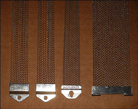 The top two snare wires in the first photo are new old stock, sets of 10 wires each with butt plates styled like the Premier 12 wires, but they are shorter in length (total length 41cm.), with small screw sized mounting holes spaced 40cm. apart.