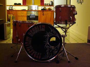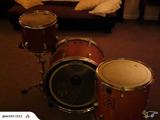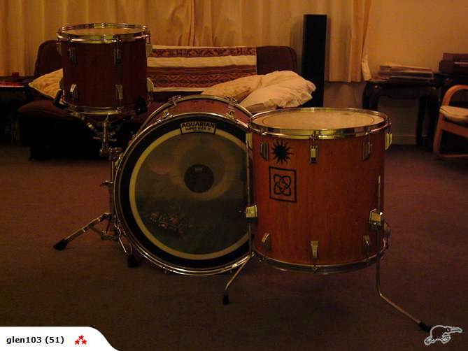 That's funny-MIT stencil of a mid line Tama kit.At least it has enough lugs to actually tune them,unlike newer China's with 6-lug floor toms and 5-lug mounted toms.You know,luan just doesn't look that great finished.Sort of like a H.S.wood shop project,like a napkin holder.
