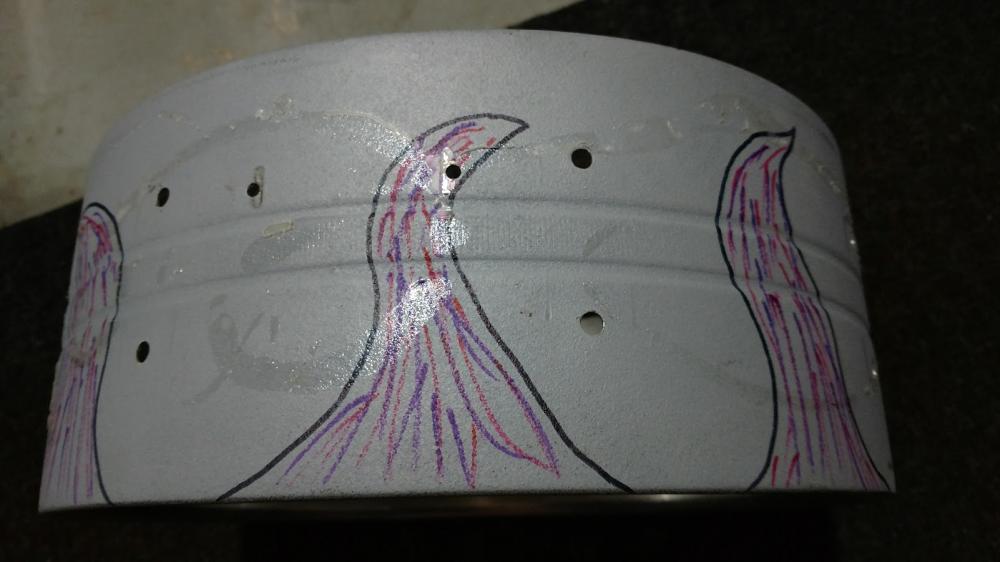 Under the wrap, the snare had been painted a flat gray-ish color (sort of similar to an Acrolite) and had been drawn on with crayon. Yes, crayon. And not by a child either. The artwork was a little too good for that. I attached some photos. As much as I want to think "Grrrr, who would do that?!?!?", another part of me thinks "That was creative".