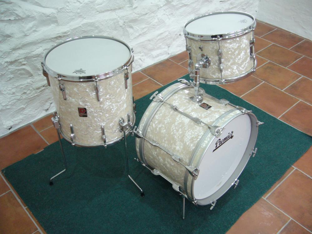 I see your set has hit an evolutionary cusp, you have what is commonly referred to as a "dagger" mount on the bass and 3point spigot plate to the 12, just like the BDP set below. The dagger mount supercedes the original "disappearing" style arm/mount as seen on the White Pearl below which in turn is replaced by what I like to refer to as the "eartrumpet". Quite possibly the single most useless piece of hardware ever produced by Premier in my opinion. Or maybe it is the other way around, can't quite remember!