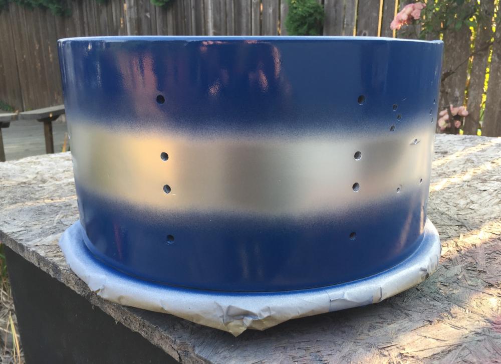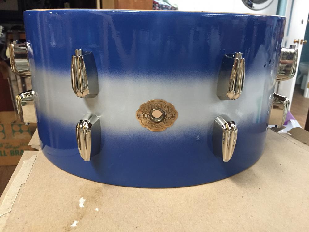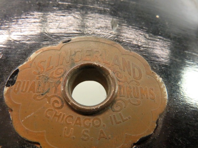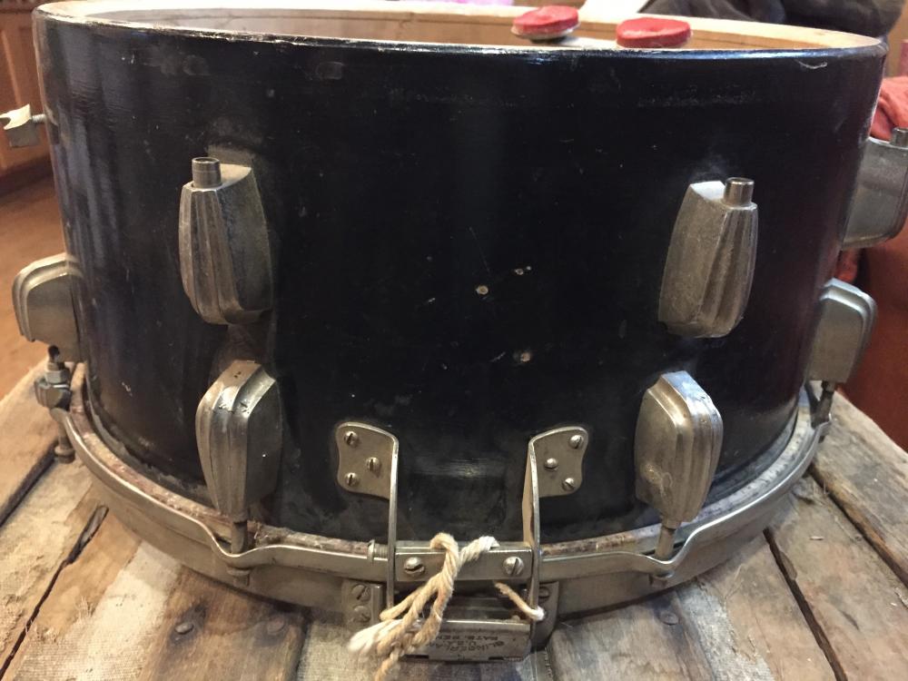 Story of this drum: I purchased this at auction and upon examination, found that it was brush painted in black with no original finish remaining, 9 of the 16 lugs were cracked, broken, or missing, and the top engraved hoop was missing (looking for one in nickel if anyone has a spare). When I removed the badge, I found remnants of very fragile silvery blue lacquer finish typical of their silver and blue Duco paint scheme. The flaking finish probably inspired the brushed on black paint.